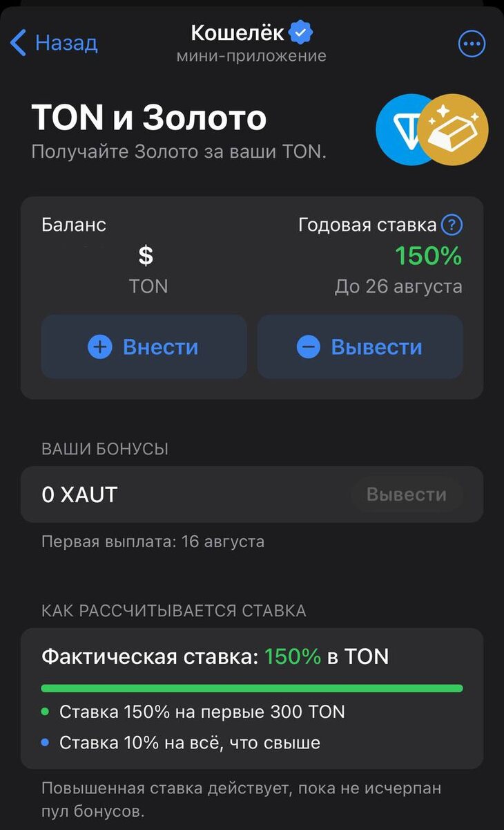 🥇 Тестирую «TON и Золото» в Telegram-кошельке: 150% годовых на первые 300 TON (дальше 10%), выплаты в XAUT (Золото от Tether