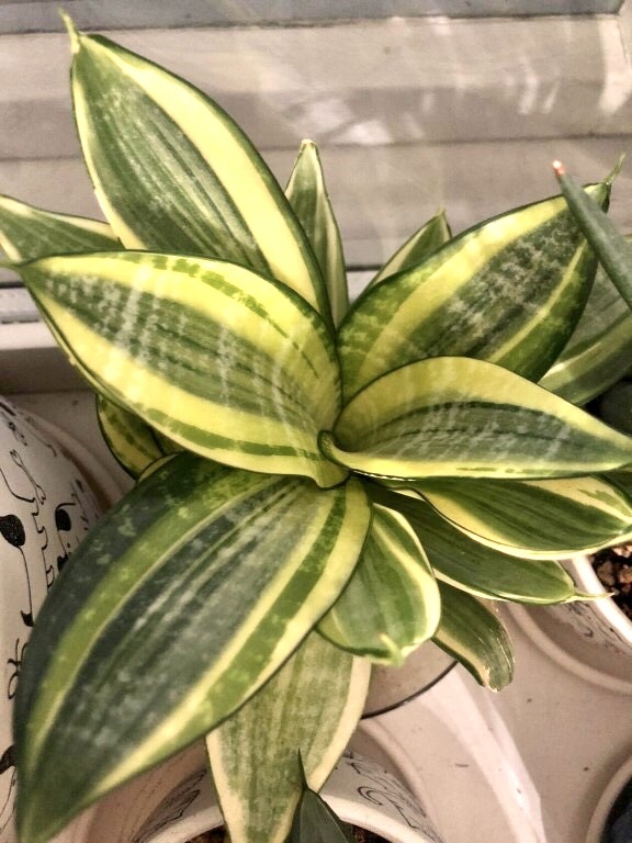 Сансевиерия Ханни Голден (Sansevieria Hahnii Golden) – это компактный и декоративный сорт сансевиерии. Форма: Тип роста: Розеточный, листья растут веерообразно из подземного корневища. Форма: Широкие, мясистые, мечевидные, с заостренными кончиками. Размер: Длина – 15–25 см, ширина – 4–7 см. Поверхность: Гладкая, с легким восковым налётом, который уменьшает испарение влаги. Края: Ровные, без зазубрин. Листья: Широкие, короткие, мечевидные. Цвет: Темно-зеленый, по краям листьев проходят широкие золотисто-желтые или кремовые полосы. Центральная часть может иметь поперечные светлые разводы. Рост: Медленный, образует плотные кустики. Цветение: Редко, мелкими бело-зелеными цветками. ☀️Яркий рассеянный свет (подходит и полутень, но пестролистность ярче при хорошем освещении). 💧Умеренный, только после просыхания грунта. Засухоустойчива, боится переувлажнения. 🌱 Легкая почва, дренированная (подойдет смесь для суккулентов с песком или перлитом). 🌡️ +18–25°C, зимой не