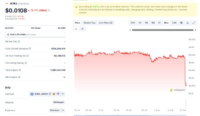 ❗️Санкции США ударили по рублёвому стейблкоину A7A5 14 августа 2025 года Управление по контролю за иностранными активами Минфина США (OFAC) внесло в санкционный список киргизскую компанию Old Vector LLC, эмитента рублёвого стейблкоина A7A5, а также связанные с ней структуры и партнёров. 📝 В релизе OFAC прямо указано, что A7A5 был создан при участии криптобиржи Garantex и использовался для компенсации средств клиентам после блокировки биржи и перевода её операций на преемника — платформу Grinex. После введения санкций токен начал отображаться с заметным дисконтом к официальному курсу на агрегаторах. По данным CoinGecko и CoinMarketCap, A7A5 сейчас стоит $0,0108 за рубль, что на 13% ниже референсного значения ($0,01253 по курсу ЦБ). Это соответствует курсу USDRUB ≈ 92,6 против официальных 79,8 — фактически закладывая доллар на 12 рублей дороже. ❕ Ночью произошёл и резкий ценовой сбой: на Uniswap котировки кратковременно показали $22,48 за 1 рубль — в 1 800 раз выше реального значен