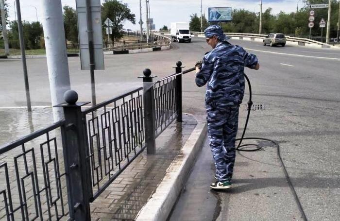 В Астрахани специализированными аппаратами моют остановки и леерку