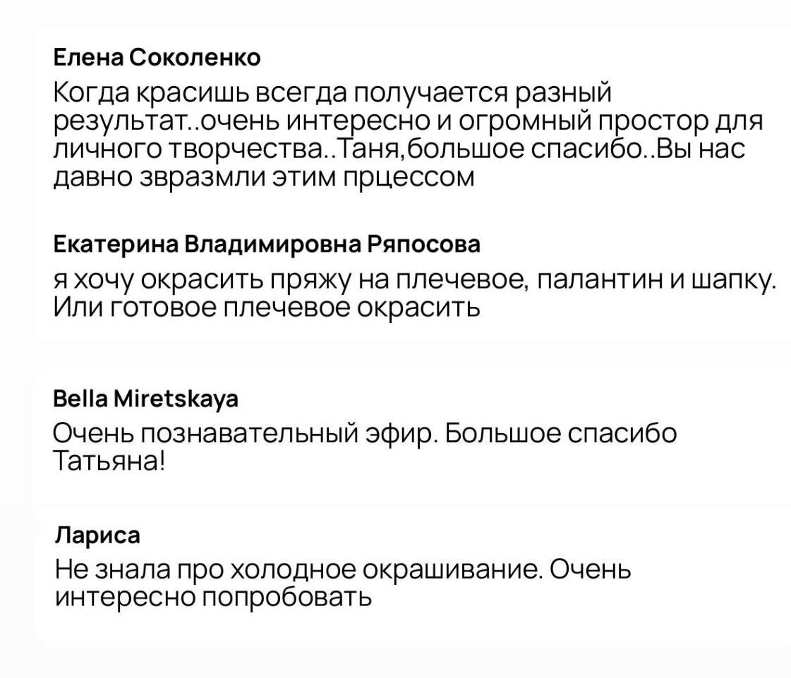 Вот как классно прошёл эфир по крашению пряжи 👆🏻🎨 🧶 В клубе «Вязальная семья iNitki» прошло настоящее творческое событие — встреча с Татьяной Комковой, посвящённая крашению пряжи. Татьяна щедро делилась опытом - тонкостями закрепления цвета и создания плавных переходов. А вы когда-нибудь пробовали красить пряжу сами? Делитесь своим опытом или мечтой попробовать в комментариях 💛