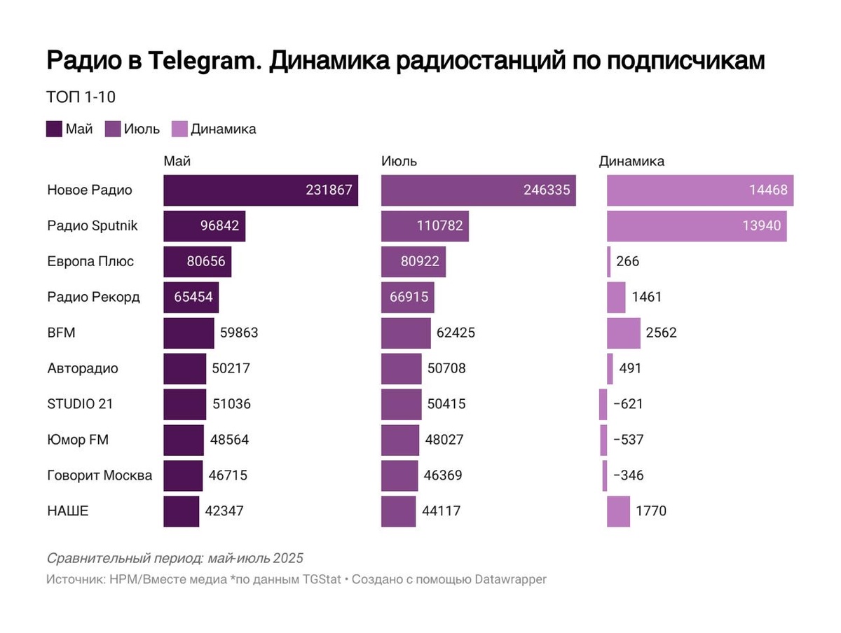 Радио в Telegram. Динамика радиостанций по подписчикам (Май - июль 2025) В отчетный период Новое Радио и Радио Sputnik лидеры по приросту подписчиков. За 12 месяцев лидерами по приросту являются 3 радиостанции - Новое Радио, Радио Sputnik и Европа Плюс. ➡️ Новое Радио — абсолютный лидер рейтинга по числу (246 335) подписчиков и единственная радиостанция в категории >200К подписчиков (в июне 2024 года — 151506) ➡️ Радио Sputnik (110 782) перешел в июне в категорию >100К подписчиков (в июне 2024 — 43500) ➡️ В категории >50К сейчас находятся 5 радиостанций: Европа Плюс, Радио Рекорд, BFM, STUDIO 21 и Авторадио, которое пересекло рубеж в июле ➡️ Авторадио (50 708) обгоняет в июле STUDIO 21 (50 415) и поднимается с 7-го на 6-ое место рейтинга ➡️ Comedy Radio (24 728) поднялось в июне с 18 на 17 место рейтинга, опередив Радио MAXIMUM (21 038) Топ-5 радиостанций по числу подписчиков: 1. Новое Радио — 246 335 📈+14 468 2. Радио Sputnik — 110 782 📈+13 940 3. Европа Плюс — 80 922 📈+266 4. Ра