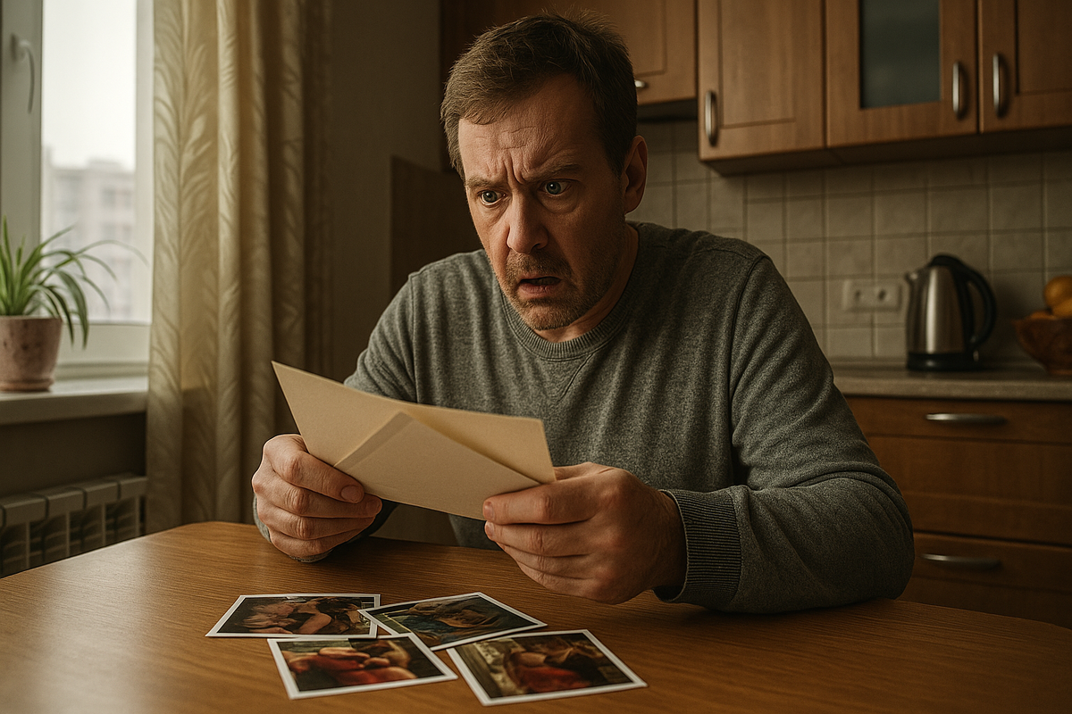 Дрожащими руками Максим вытряхнул содержимое конверта. Сначала выпали обычные фотографии — Анна в летнем платье на детской площадке, улыбающаяся в камеру. Потом снимки стали более откровенными — она в нижнем белье в какой-то незнакомой комнате. И наконец — то, от чего у Максима потемнело в глазах.