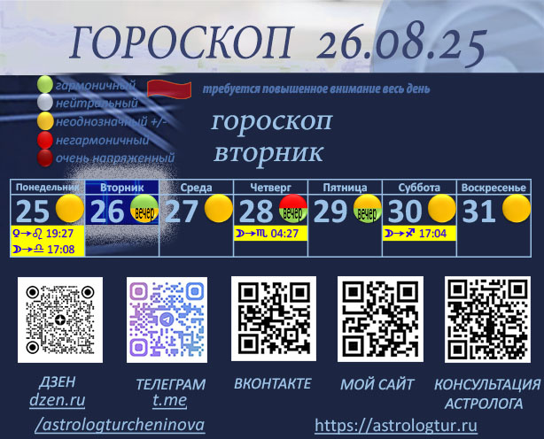 Сегодня на нас влияют сразу 4 мощных аспекта Венеры — планеты симпатий, желаний, отношений, финансов, гармонии и красоты: три благоприятных и один напряжённый. Это значит, что события могут развиваться в любой из этих сфер.. Одновременно с этим, в период с 14 до 21 часа (мск), будет соединение Луны с Марсом, что может принести, как плюсы, так и минусы. Положительные моменты: ускорение процессов, повышение решительности, инициативность, способность быстро схватывать информацию. Возможные сложности: спешка может привести к ошибкам, раздражительность, вероятность конфликтов. Основные аспекты Венеры, которые сегодня на нас влияют: БЛАГОПРИЯТНЫЙ АСПЕКТ ВЕНЕРЫ С САТУРНОМ (кульминация 26.08.25, влияние с 25.08.25 по 28.08.25). Аспект укрепляет отношения, придаёт им серьёзность и стабильность. Хороший период для построения долгосрочных союзов, решения финансовых вопросов. Аспект способствует развитию уважения, доверия и гармонии в любви и партнёрстве. В благоприятных условиях он приносит усто