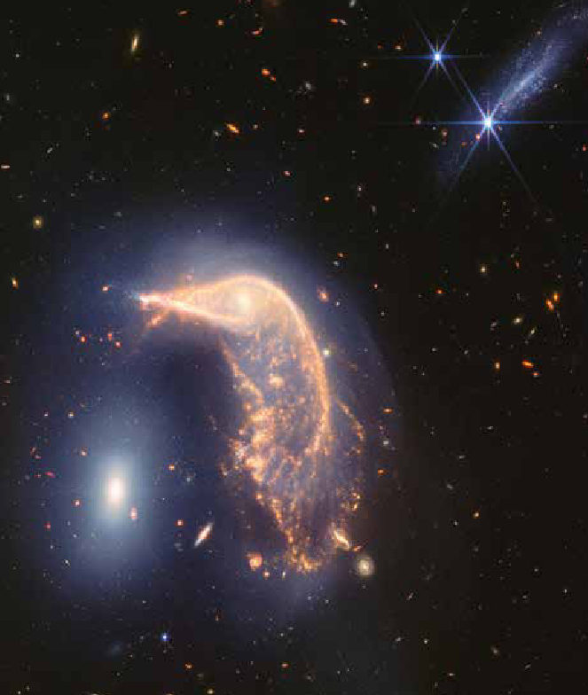 На фото: Результат двухлетней научной работы с космическим телескопом. Время летит незаметно, когда ты развлекаешься и делаешь космические открытия. В годовщину начала своих научных операций космический телескоп Джеймса Уэбба представил этот, сделанный в инфракрасном диапазоне снимок Арп 142 — пары взаимодействующих галактик, также известных как Пингвин (NGC 2936, в центре) и Яйцо (NGC 2937, слева). Снимок сочетает в себе виды, сделанные в ближнем и среднеинфракрасном диапазонах. Галактики в настоящее время находятся всего в 100 000 световых лет друг от друга. Астрономы утверждают, что галактики оказались недалеко друг от друга впервые примерно 25-75 миллионов лет назад. Они сблизятся ещё несколько раз прежде чем объединятся в одну галактику. Взаимодействие исказило Пингвина — изначально спиральную галактику, придав ей форму, которую мы видим сейчас. Яркое ядро образует глаз и голову птицы, в то время как «волны» звёзд формируют её пернатое тело. Напротив, компактное эллиптическое Яйцо