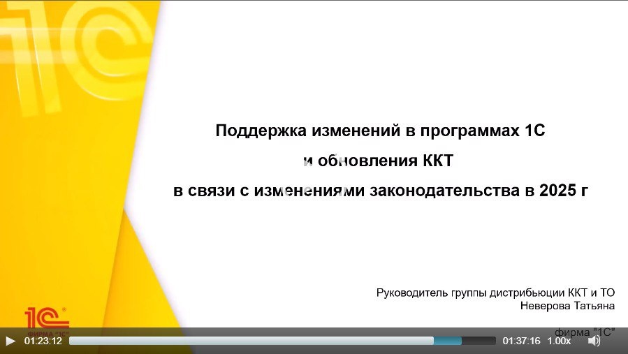 ‼️ О поддержке изменений формата фискальных данных с 1 сентября 2025 года в программах 1С рассказала Татьяна Неверова, эксперт 1С в лекции на тему Переход на новый формат фискальных данных с 1 сентября 2025 года: анализ изменений, поддержка в 1С. Также были рассмотрены вопросы: 01:23:30 Поддержка новых форматов фискальных документов изготовителями ККТ и 1С 01:23:38 Формат фискальных документов (ФФД) 01:25:25 Изменения ФФД с 1 сентября 2025 01:25:49 Кто должен обновить прошивку ККТ? 01:26:30 Фискальный накопитель заменять не потребуется 01:26:46 Административная ответственность 01:27:21 Обновление прошивки и драйвера ККТ 01:27:49 Соответствие ККТ законодательству 01:28:51 Рекомендации 01:29:42 Технические проблемы работы ККТ, связанные с несвоевременным обновлением прошивки и драйвера ККТ 01:29:53 Для чего нужно обновлять драйвера и прошивки ККТ 01:31:11 Порядок обновления конфигураций 1С 01:31:43 Обновление программ 1С 01:32:22 Для чего нужно обновлять драйвера и прошивки ККТ 01:33:3