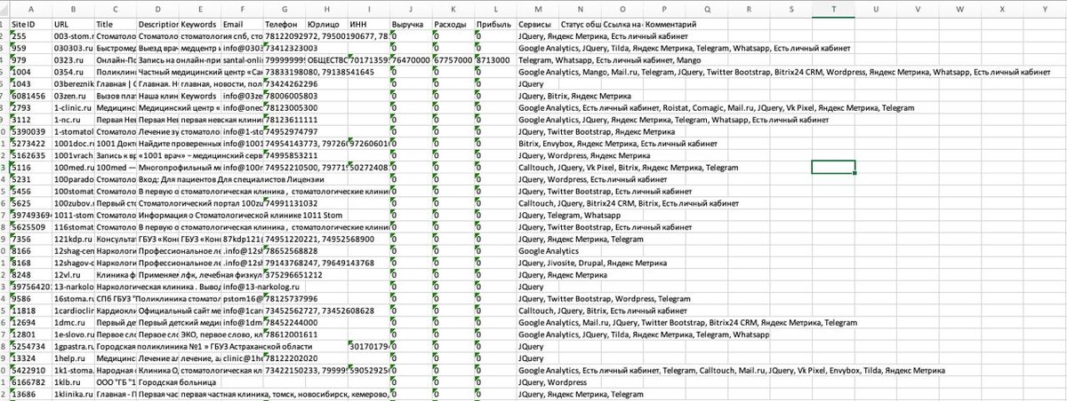 А вот пример выгрузки из osintmonster по медклиникам - сайт, контакты, выручки (но редко), технологии на сайте. Контакты все с сайта, никаких перс данных. Даже есть колонки где можно проставить статус общения и ссылку на сделку в crm, чтобы всю сырую базу в crm не заливать. Удобно