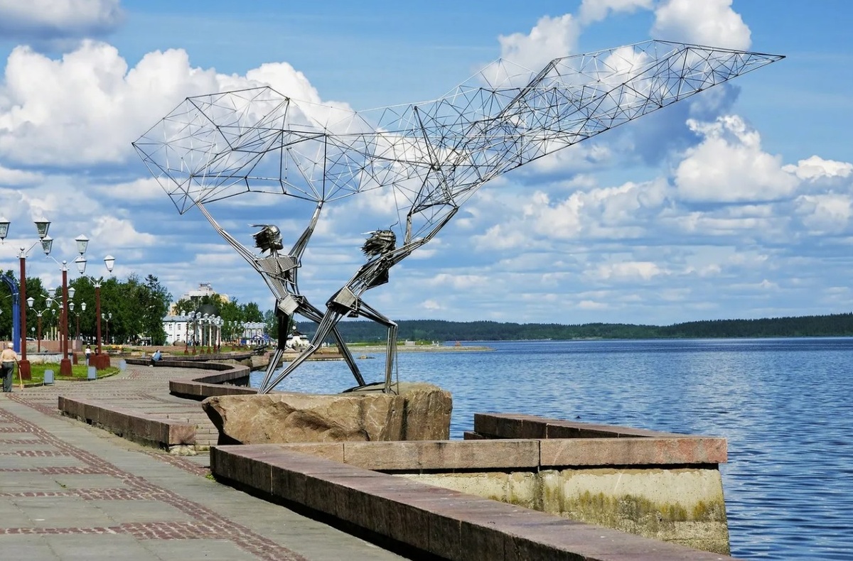 Петрозаводск находится у Онежского озера, город в котором с одной стороны вроде как ничего особенного, а с другой стороны я вообще не пожалела что туда съездила. Всё-таки там есть то что я люблю, а именно тишина, спокойствие и... просто можно дышать. Доехала туда на поезде, я ехала из Питера, потому что это самый удобный вариант если не хочется тратить полдня. Поезд ночной, утром вышла и сразу пошла по проспекту Ленина. Он ведёт как раз к воде. По пути видела Карельский театр, здание администрации, и старые дома в которых окна криво стоят, но в этом есть своё что-то. Я сразу решила сначала дойти до озера. Это набережная которая тянется вдоль берега, около 1500 метров я насчитала. Там настилы из дерева, скамейки, фонари. Женщина одна сидела с термосом и варёным яйцом, ела и смотрела в воду. Не знаю почему я это запомнила. Первая скульптура на маршруте это "Рыбаки" из Норвегии. Там мужики в лодке, у них весла и усы. Местные на них не смотрят, видно что привыкли. Потом идёт финский "Т