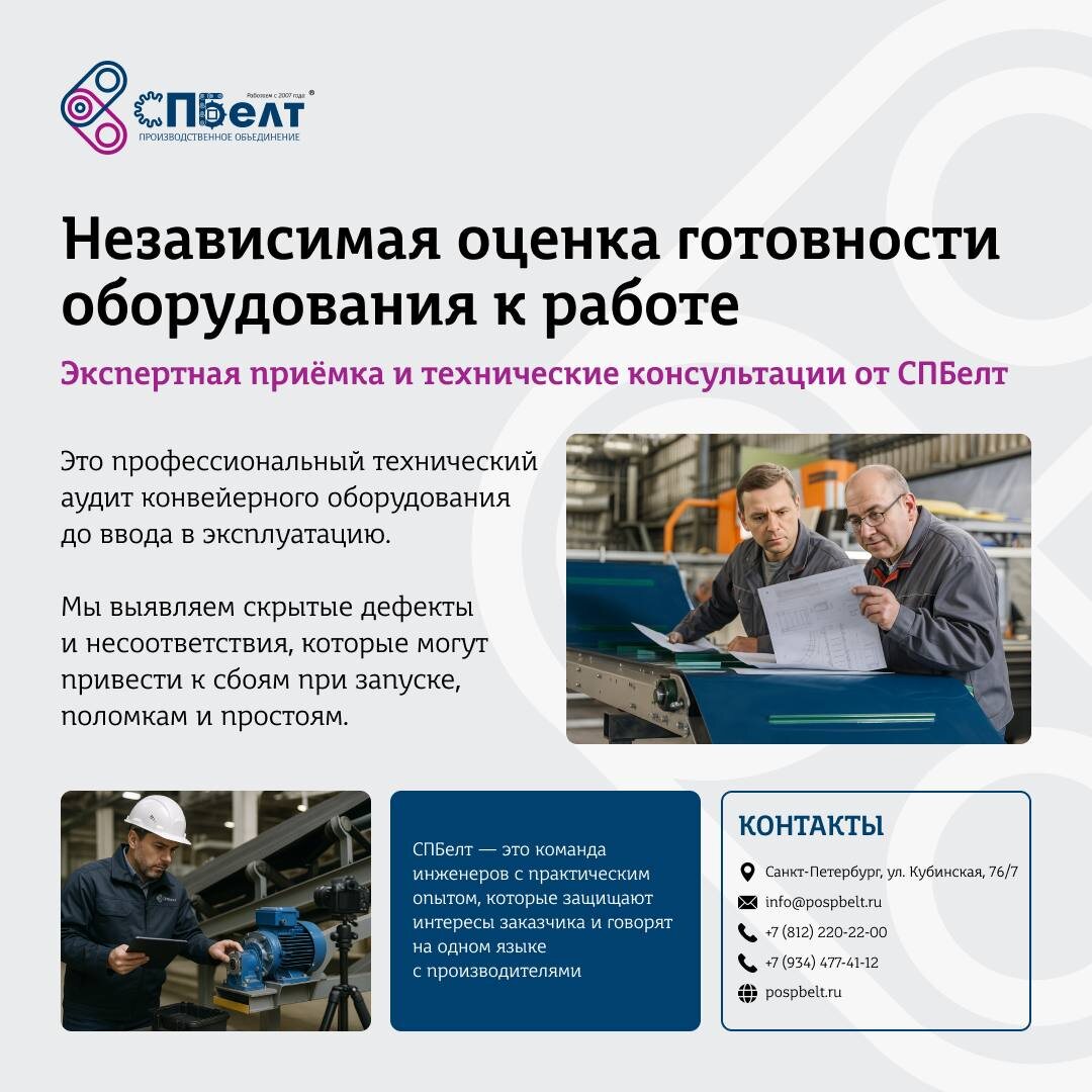 ✅ НЕЗАВИСИМАЯ ОЦЕНКА ГОТОВНОСТИ ОБОРУДОВАНИЯ К РАБОТЕ Экспертная приёмка и технические консультации от СПБелт Это профессиональный технический аудит конвейерного оборудования до ввода в эксплуатацию. Мы выявляем скрытые дефекты и несоответствия, которые могут привести к сбоям при запуске, поломкам и простоям. 🔍 Что включает экспертная приёмка: • Сопровождение при приёмке оборудования от стороннего поставщика (в том числе за границей) • Проверка соответствия проектной документации, техническому заданию • Контроль качества монтажа и сборки • Оценка рисков • Фотофиксация выявленных нарушений, письменное заключение с рекомендациями 🧭 Консультации СПБелт — это: •Техническое сопровождение при подборе оборудования и комплектующих • Анализ схем и технических решений на предмет реальной работоспособности • Оценка рисков износа, перегрузки, сложностей в эксплуатации • Рекомендации по корректировке конструктивных решений ещё до поставки или запуска • Поддержка клиента в диалоге с поставщико