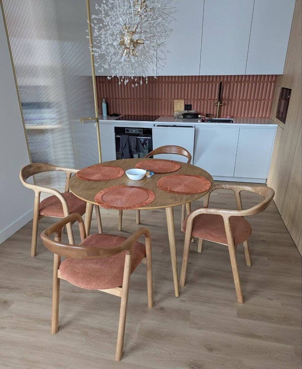 Столовая группа из массива выглядит очень стильно и современно. Стол — круглый, выполненный из натурального дерева, с гладкой поверхностью, что подчеркивает текстуру и теплый оттенок. Стулья — также из массива дерева, с мягкими сиденьями, обитыми премиальной тканью. У них элегантные линии и обтекаемые формы, что добавляет уют и стиль.