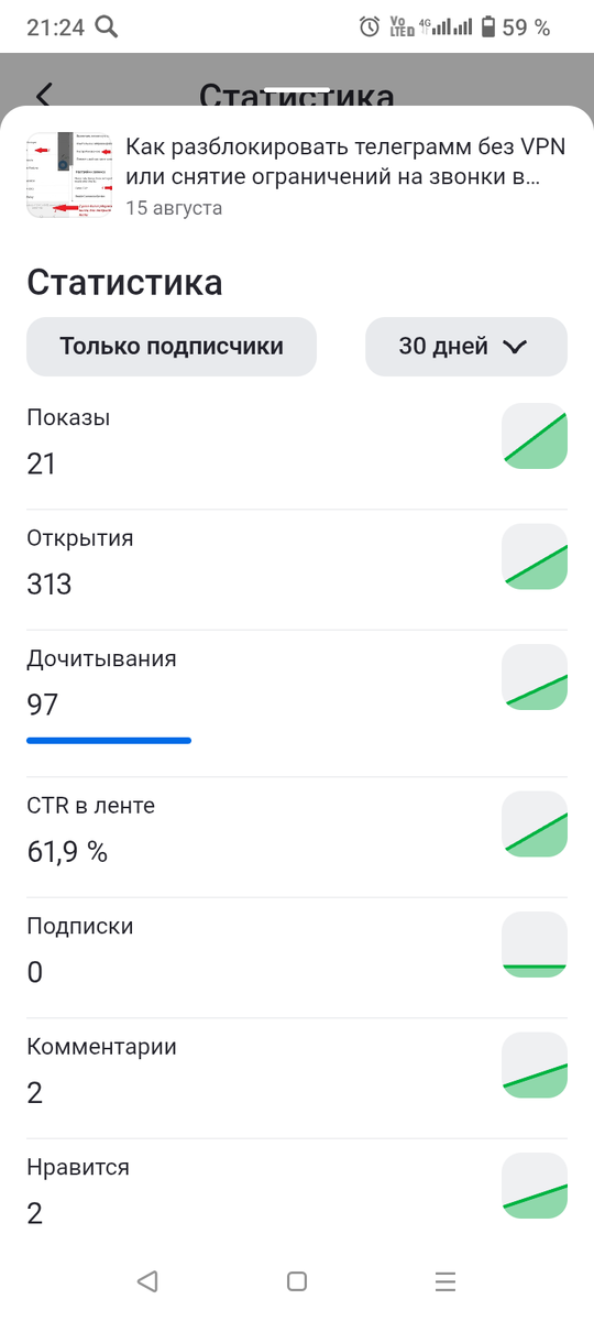Вопрос к взаимщикам и другим блогерам дзена. Как часто у Вас бывает такая ситуация, когда показов в дзене практически нет, но дочиток намного больше? Я так понимаю, постольку поскольку тема животрепещащая, то основные переходы идут из поисковиков. Самое интересное, что алгоритмы дзена практически не работают, зато очень хорошо работает Яндекс поисковик, возможно гугл поисковик. Вот еще два скриншота, что это подтверждает: Казалось бы, судя по отношению количества показов к количеству просмотров, СТR должен зашкаливать. А тут мы видим, что ctr практически на нуле. Однако CTR всего лишь показывает, как идёт продвижение в дзене. То есть это отношение количества показов в ленте дзена к количеству переходов к статье и их прочтению. А в дзене продвижения оказывается практически нет, не смотря на интерес читателей к статьям в целом. Мне было интересно, как поведут себя статьи, оптимизированные по ключевым словам Яндекс запросов и как поведет себя платформа дзен. В итоге пришёл к выводу, чт