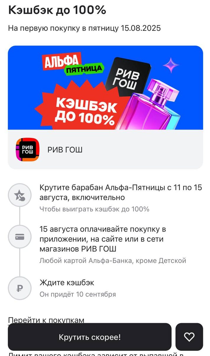 Девочки, срочно! Работает! Сегодня крутите барабан в альфа банке и вам выпадает процент кешбека: от 10% до 100% Мне выпал кэшбек 30% Чтобы пришел кешбек надо совершить покупку в Рив Гош от 1000р + в Рив Гош появились новые промокоды СУПЕР -3000 от 7000р МЕГА -6000 от 14000р ТОР -10000 от 20000р Друг с другом все суммируется, можно сделать очень выгодную покупку 🤭🤭