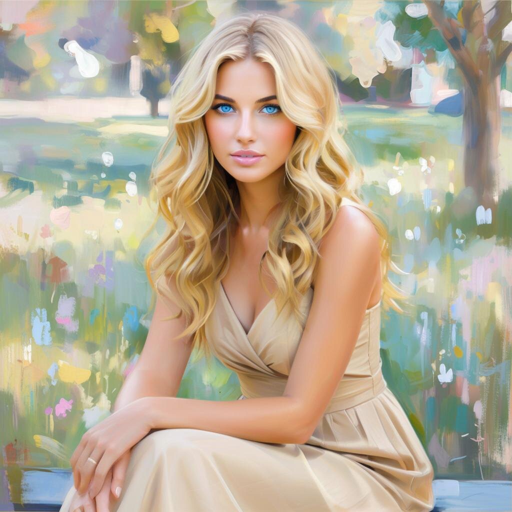 Ядвига пришла вовремя, её образ был лёгким и воздушным. Она была одета в изящное бежевое платье, которое подчёркивало её стройную фигуру. Ее длинные локоны свободно спадали на плечи, образуя мягкие волны, которые переливались в свете фонарей. Она подошла к скамейке под огромным дубом, чья густая, почти синяя тень надёжно укрывала её от последних лучей заходящего солнца.