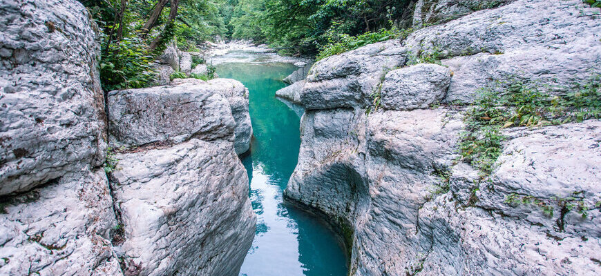 Белоснежный каньон с самыми запоминающимися природными достопримечательностями. Локация, скрытая в густом лесу среди водопадов и горных рек. Мир скал и таинственных непроходимым дорог. Место, где белый цвет так и слепит. Территориально каньон расположен на высоте 250 метров над уровнем моря. Он относится к землям Сочинского национального парка. Своим названием локация обязана белоснежным слоистым породам скал, которые растянулись на 150 метров в глубину. Каньон окружён не только густым лесом, но и расположенными в нём папоротниками, реликтовыми деревьями с обвитыми вокруг оси лианами. Кстати, вода в горной реке, протекающей между скалами, настолько идеальная, что в ней водятся даже пресноводные крабы. А это показатель отменной чистоты воды. Разумеется, здесь предусмотрен удобный пешеходный маршрут, растянувшийся примерно на 4 км. Без спусков, подъёмов и переправ тут точно не обойтись. Оригинальность сочетания белоснежных скал с рифлёной текстурой и изумрудного цвета воды в горной реке