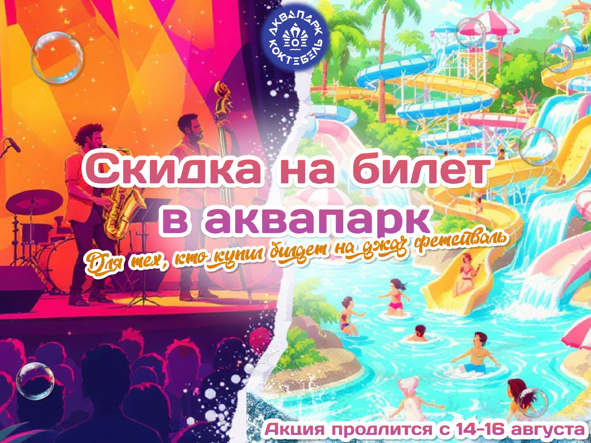Купили билет на фестиваль? С 14 по 16 августа он станет вашим пропуском в аквапарк "Коктебель" по суперцене 1000₽! Всё просто: Подробно о фестивале джазовой музыки в Коктебеле 2025 по ССЫЛКЕ