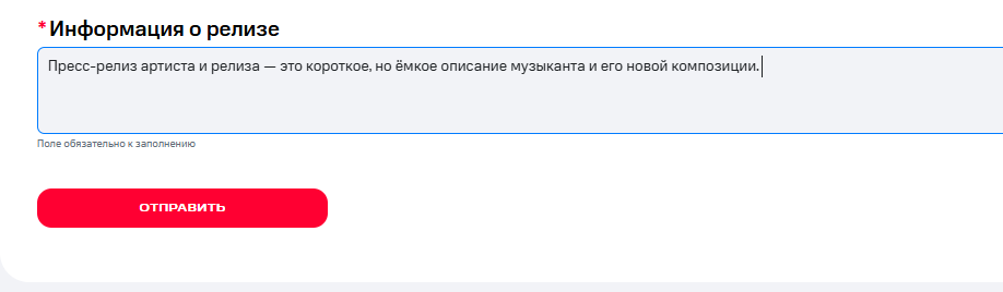 Пресс-релиз артиста и релиза — это короткое, но ёмкое описание музыканта и его новой композиции. В нём отмечают ключевые моменты: жанр песни, концепцию, вдохновение и особенности. Это может быть история создания, чему посвящён, настроение и т.д. Чем короче и яснее, тем лучше. У редакторов нет времени на длинные тексты. Пресс-релиз должен быть не более 1000 знаков. Иначе он не поместится в форму для питчинга.