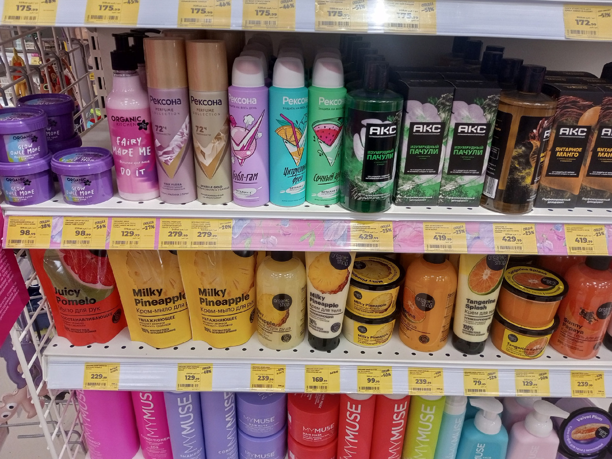 Самые прекрасные для меня полки в этот раз выглядят так: обратите внимание на нижнюю полку, где уходовые средства стоят всего от 79 рублей (за такую цену можно купить крем для тела), добавить сюда еще дополнительную скидку и получится настолько низкая цена, что аж не верится. У "Organic Kitchen" тоже недорогой уход, крем для лица стоит 98 рублей; особенно засматриваюсь на средства от "Рексона", это неплохие ароматизированные дезодоранты за 189 рублей, а за 279 мы получаем более дорогой аромат.