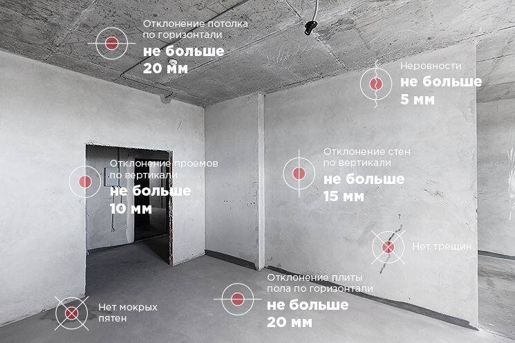 — Стены, потолок, пол — проверьте ровность уровнем, наличие трещин, сколов, пятен или следов влаги