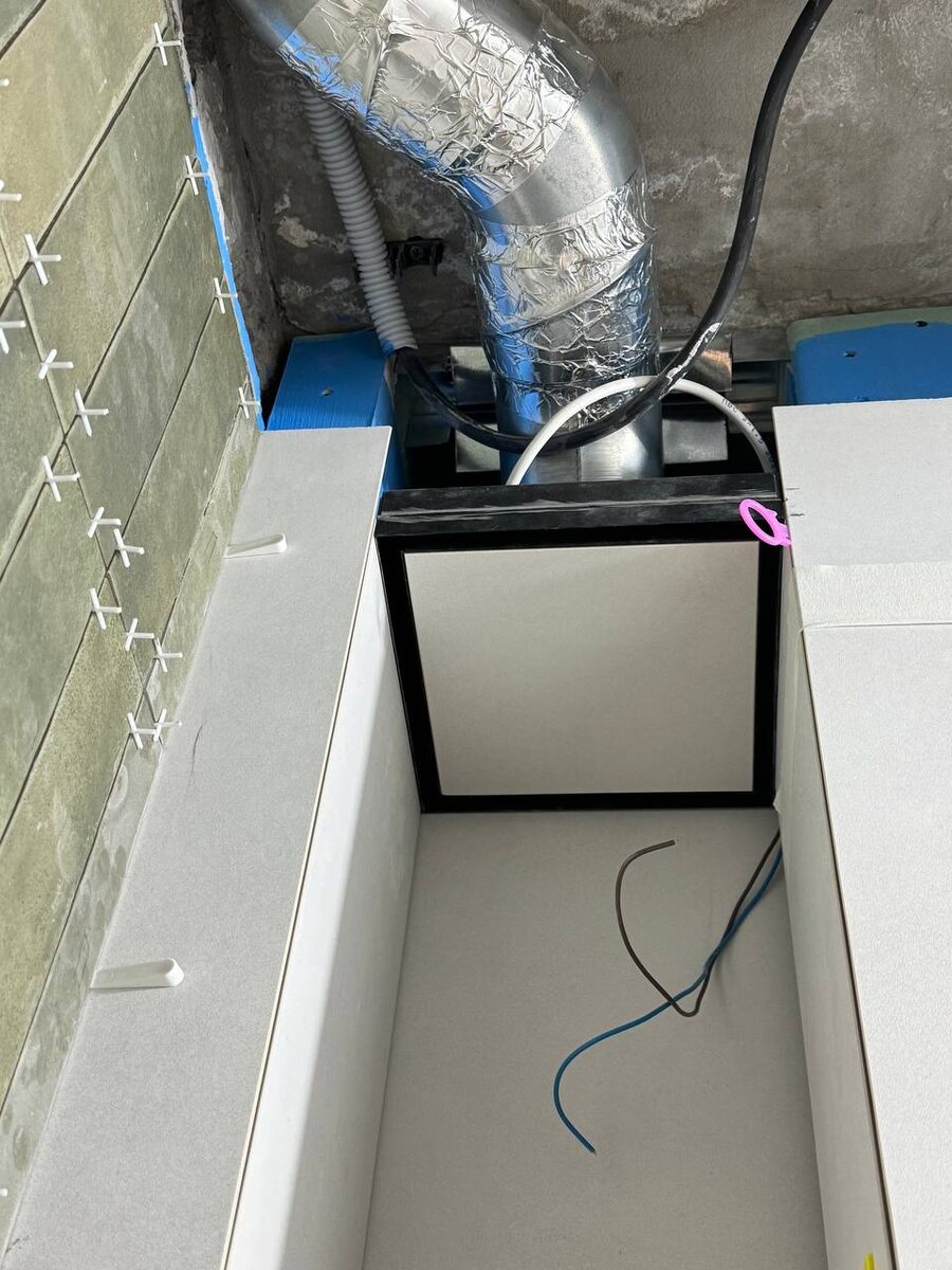 Сегодня на стройке! ЖК Лица ▪️В мастер-ванной комнате уложили плиточку🥰 ▪️Сделали аккуратную нишу для полочек ▪️Воевала за этот узел с вентиляцией и не зря. Не хотела чтобы была неаккуратная мелкая подрезка вокруг красивой магнитной решетки с вставкой из керамогранита. Заказала размеры решетки прямо ровно в размер ниши, но нам мешали «уши» с двух сторон, поэтому строители-золотые руки предложили их обрезать «нафиг». Осталась одна пара ушей этого достаточно чтобы все отлично держалось в боковых стенках👌