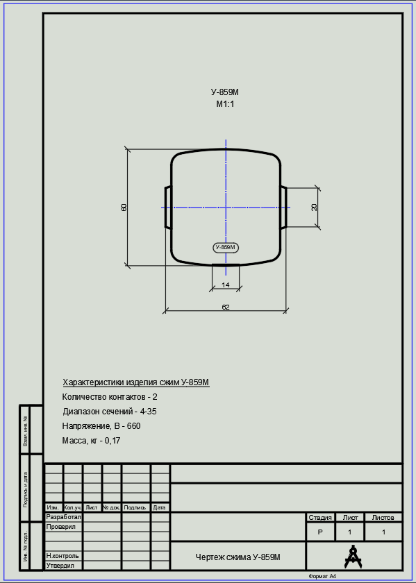Сжим У-859М предназначен для выполнения ответвлений от магистральных линий кабелей и проводов напряжением до 660 В. Монтаж производится без разрезания проводника, с предварительным снятием изоляции на месте установки. · Номинальное напряжение: до 660 В (0,69 кВ) · Сечение магистрали: 50-70 мм² · Сечение ответвления: 4-35 мм² (с градацией 4/6/10/16/25/35) · Размеры корпуса: 62×61×43,5 мм · Тип соединения: болтовое · Степень защиты: IP20 · Материал корпуса: поликарбонат, не поддерживающий горение · Контактная часть: анодированная сталь · Сердечник: профилированные плашки под типоразмер кабеля · Конструкция: негерметичная · Универсальность: возможность соединения алюминиевых и медных проводов, а также их комбинации · Гарантийный срок хранения: 10 лет · Гарантийный срок эксплуатации: 10 лет · Срок службы: 40 лет · Сертификация: имеет сертификат соответствия EAC · Возможность монтажа без разрезания магистрального провода · Универсальность применения (медь/алюминий) · Долговечность материало