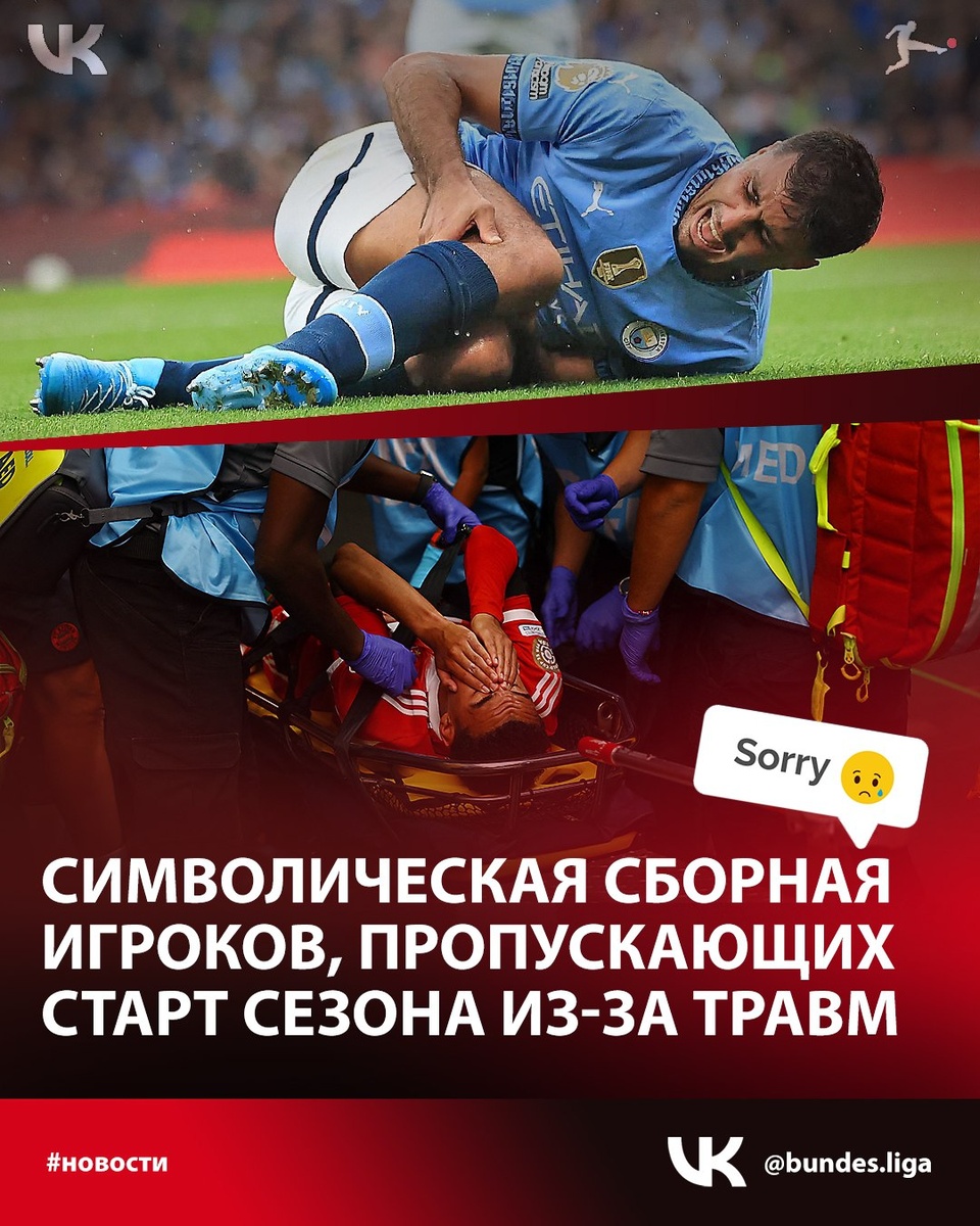 ⚽ Символическая сборная из 11 игроков, пропускающих старт сезона-2025/2026 из-за травм🚑 по версии Transfermarkt: - Марк-Андре тер Штеген («Барселона») - Конор Брэдли («Ливерпуль») - Алессандро Буонджорно («Наполи») - Ливай Колуилл («Челси») - Альфонсо Дэвис («Бавария») - Родри («Манчестер Сити») - Эдуарду Камавинга («Реал» Мадрид) - Джуд Беллингем («Реал» Мадрид) - Деян Кулушевски («Тоттенхэм») - Джамал Мусиала («Бавария») - Габриэл Жезус («Арсенал»).