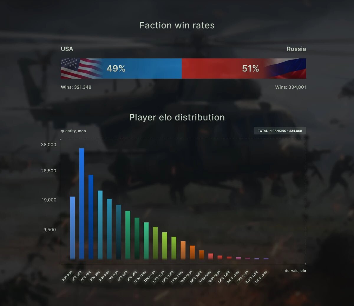 Разработчики Broken Arrow продолжают уделять особое внимание обеспечению честного игрового процесса. Команда, состоящая из опытных игроков с многолетним стажем в жанре военных стратегий, регулярно проводит мониторинг статистики и лично тестирует балансные изменения. https://www.youtube.com/watch?v=5wme6rH6JgA В игре внедрена усовершенствованная система рейтинга ELO. В отличие от классического варианта, здесь установлены особые правила. Начальный рейтинг игроков теперь составляет 300 очков, а на первых этапах новички получают больше очков за победу, чем теряют за поражение. Такой подход помогает новым игрокам быстрее достичь среднего уровня рейтинга и избежать серии тяжелых поражений в начале пути. При этом чем выше мастерство игрока, тем быстрее он продвигается по рейтинговой лестнице. На высоких уровнях бонус исчезает, и всё решает исключительно мастерство. По результатам анализа более 656 тысяч матчей с участием 224 860 игроков были получены впечатляющие данные. Фракция США одержала