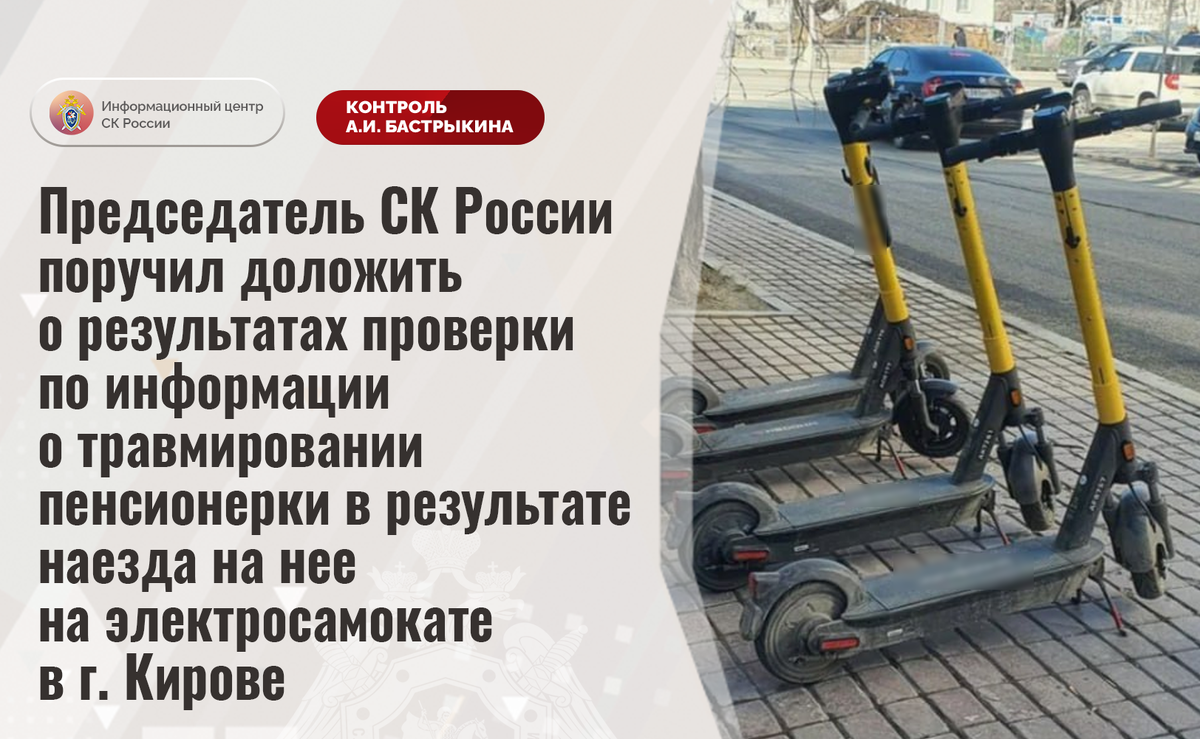 Председатель СК России поручил доложить о результатах проверки по информации о травмировании пенсионерки в результате наезда на нее на электросамокате в г. Кирове В телеграм-канале сообщается, что 12 августа текущего года в городе Кирове водитель средства индивидуальной мобильности сбил 70-летнюю женщину в пешеходной зоне, после чего скрылся с места происшествия. Пострадавшая получила телесные повреждения. В СУ СК России по Кировской области организована процессуальная проверка. Председатель Следственного комитета Российской Федерации Александр Иванович Бастрыкин поручил и.о. руководителя СУ СК России по Кировской области Максиму Сергеевичу Козлову доложить о промежуточных результатах процессуальной проверки и принятом по итогам решении. Исполнение поручения, а также ход процессуальной проверки поставлены на контроль в центральном аппарате ведомства. #СледственныйКомитет #СКРоссии #СКР #ИЦСКР #ИнформационныйЦентр #АлександрБастрыкин #ПредседательСКР #КонтрольПредседателяСКР #Комментари