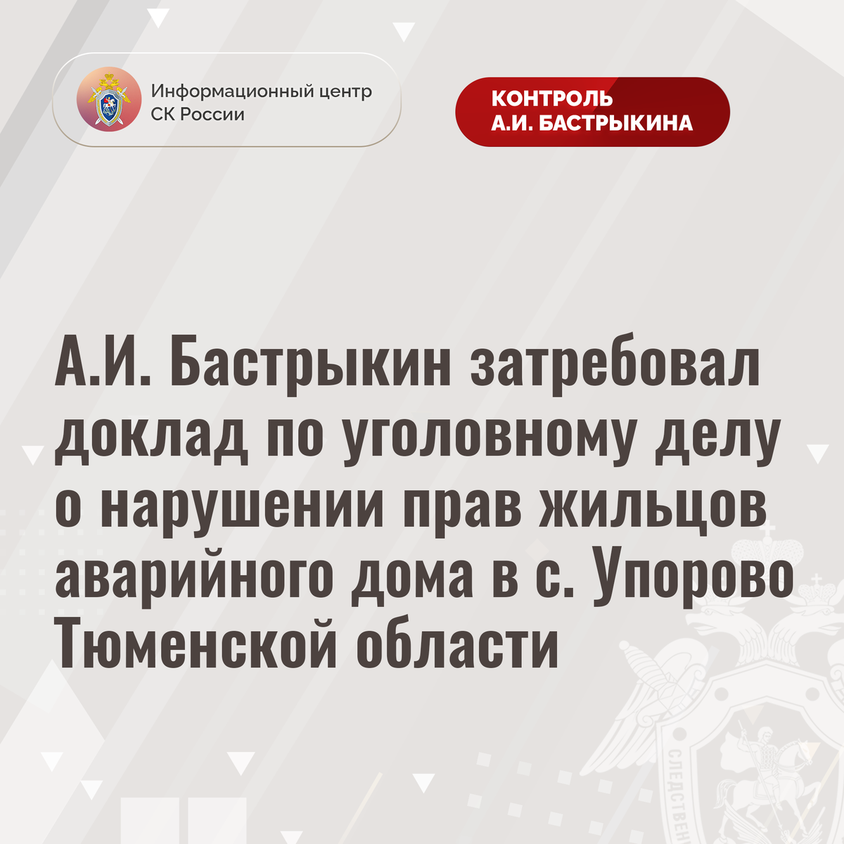 А.И. Бастрыкин затребовал доклад по уголовному делу о нарушении прав жильцов аварийного дома в с. Упорово Тюменской области К Председателю СК России А.И. Бастрыкину через Информационный центр поступило обращение по вопросу нарушения прав жильцов многоквартирного дома на улице Советской в селе Упорово Тюменской области. Здание, 1961 года постройки, находится в непригодном состоянии: фасад и фундамент разрушаются, деревянные конструкции прогнили, в стенах образовались трещины, штукатурное покрытие осыпается. Кроме того, строение не оборудовано системами водоотведения, горячего водоснабжения и централизованного отопления. В связи со значительным физическим износом в 2020 году здание признано аварийным, однако срок расселения, установленный на текущий год, перенесен до 2027 года. Многочисленные обращения граждан, вынужденных проживать в небезопасных условиях, в компетентные органы результатов не принесли. В СУ СК России по Тюменской области возбуждено уголовное дело. Председатель Следствен