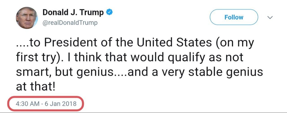 🗣Трамп о своей гениальности ~ 6 января 2018 года Американский лидер в очередной раз отвечал на критику в соцсетях и заявлял, что его умственные способности недооценивают. В Твиттере он писал, что стал президентом с первой попытки и что это вряд ли признак «неумного человека» «...стал президентом США (с первой попытки). Думаю, это можно назвать не глупостью, а гениальностью... и очень стабильной гениальностью!» #Трамп 🏛History_detail. Подписаться