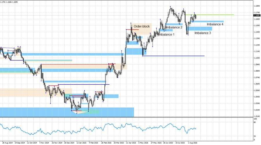 https://basechop.ru/wordpress/?p=54281 Добрый день, уважаемые трейдеры! Вторник стал для пары EUR/USD отправной точкой для нового роста. Благодаря отчету по инфляции в США, была получена реакция от имбаланса 4, что и вызвало новую атаку быков. Каждый из последних четырех имбалансов так или иначе предоставлял возможность трейдерам открывать длинные позиции. Лишь имбаланс 3 был отработан не очень точно. Таким образом, по системе «Smart money» трейдеры в последнее время имели возможность открыть сразу несколько очень неплохих позиций. В пятницу информационный фон был достаточно слабым, но все самые интересные события еще впереди. В Америке сегодня вышло три экономических отчета, но трейдеры ждут не экономической статистики, они ждут первых результатов встречи Дональда Трампа и Владимира Путина, которая проходит на Аляске. Вероятнее всего, результаты станут известны уже поздно ночью. Вряд ли первые переговоры такого масштаба за много лет завершатся за полчаса. Таким образом, валютный рыно