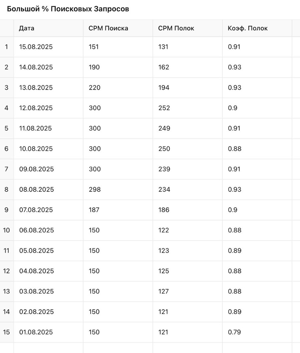 🚀🚀🚀Чем больше вы работаете с нерелевантным трафиком в запросах - тем дороже будут ваши полки 😂 Это не предположение, а факт: шах и мат! Скрины из нашего исследования: 📌 1 скрин: высокий % переходов из поиска - понижающий коэффициент от 0.85 до 0.95 📌 2 скрин: высокий % переходов на карточку - понижающий коэффициент от 0.75 до 0.85 📌 3 скрин: высокий % переходов с главной - понижающий коэффициент от 0.6 до 0.75 На 3 скрине видно, что с 1 по 10 августа, при доле главной в трафике от 80% до 60%, коэффициент был 0.6. А уже с 10 по 15 августа, когда % главной начал снижаться, коэффициент вырос до 0.73 и продолжает расти! 👉 Вывод: увеличение трафика с главной страницы снижает стоимость клика ( в зонах: главная, полки. каталог)- вы получаете трафик дешевле. ❗ А вот при росте доли поискового трафика - понижающий коэффициент (в зонах: главная, полки, каталог) увеличивается, а стоимость может стать даже выше, чем у трафика с поиска. (пост) 📌 Это касается всех! WB не расскажет