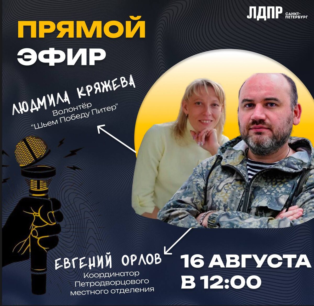 Прямой эфир ЛДПР 📅 Когда: 16 августа ⏰Время: 12:00 В прямом эфире встретятся: 🎙Евгений Орлов - координатор Петродворцового местного отделения ЛДПР 🎙 Людмила Кряжeва - волонтёр «Шьём Победу Питер» Тема эфира: гуманитарная помощь - кому, как и почему это важно. Поговорим о поддержке тех, кто особенно нуждается, и о том, как каждый из нас может внести свой вклад. Подключайтесь, будет честный и живой разговор! Задавайте вопросы в комментариях во время эфира. 🔗 Мы ВКонтакте 🖥 Сайт ЛДПР | Санкт-Петербург