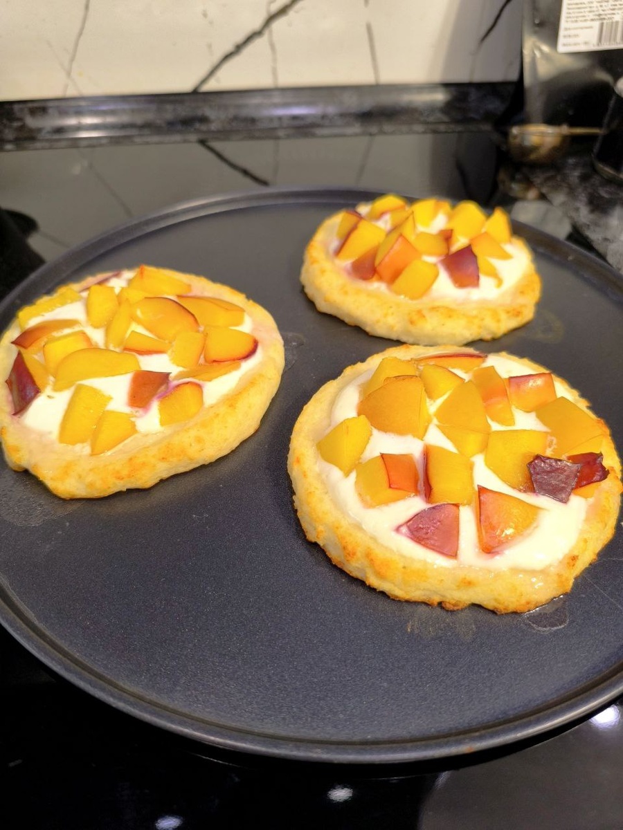 Творожные ватрушки с нектарином Ингредиенты: Творог обезжиренный - 175г Рисовая мука - 50г Яичный белок - 40г Греческий йогурт 2% - 130г Нектарин - 190г Разрыхлитель, сахзам 1) Для теста смешать 1 пачку обезжиренного творога, рисовую муку, белок 1 яйца, разрыхлитель 2г и сахзам по вкусу. 2) Разделить тесто на 3 части и сформировать основу для ватрушки. Выпекать в духовке при 180 градусах 10 минут. 3) Нектарины помыть и нарезать любым способом. Выложить на тесто греческий йогурт, посыпать сахзамом по вкусу и сверху добавить нектарин. Выпекать ещё 20 минут при 180 градусах до румяного цвета. Кбжу на всю порцию: 523 ккал/53г белков/5г жиров/67г углеводов В 1 ватрушке примерно 175 ккал. Для начинки можно добавить любой фрукт или ягоды. #выпечка #творог #десерт #завтрак #рацион
