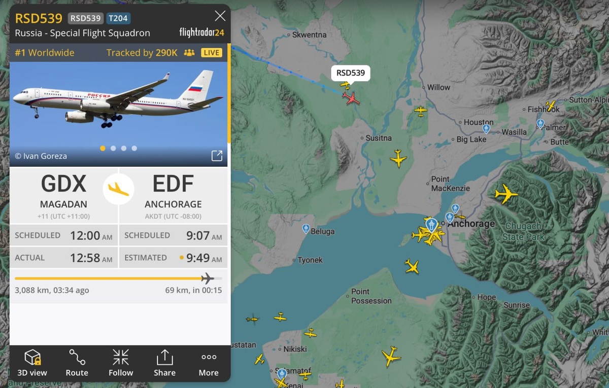 ✈️ Самолет Ту-214 с Владимиром Путиным на борту заходит на посадку в Анкоридже, свидетельствуют данные FlightRadar24