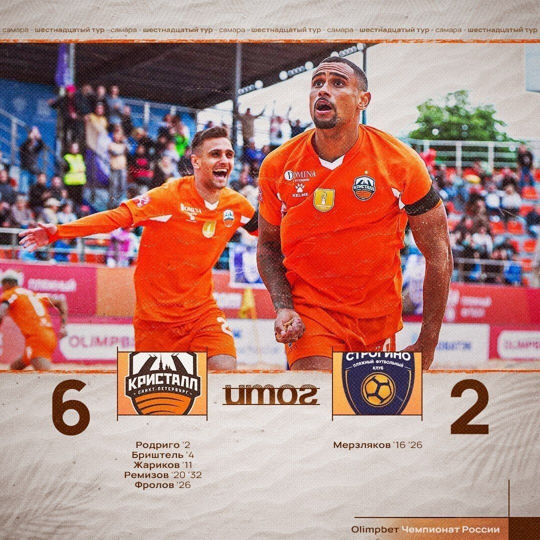 На заключительном этапе чемпионата России по пляжному футболу стартовали петербургские команды. Об этом сообщили в пресс-службе клуба «Кристалл». Сегодня, 15 августа, в Самаре начался заключительный, шестой этап чемпионата России по пляжному футболу среди мужских команд. Два петербургских клуба первые матчи провели по-разному. «Действующий чемпион страны «Кристалл» обыграл столичное «Строгино» со счётом 6:2. Дубль оформил Егор Ремизов. «Оранжевые» поднялись на промежуточное третье место», – рассказали организаторы чемпионата. Еще в одном матче «Лекс» уступил «Анапе» – 5:6. Клуб при этом сохранил шансы на выход в Суперфинал турнира, который пройдет в Санкт-Петербурге с 5 по 7 сентября. Правда, впереди ещё два матча основного раунда. Расписание петербургских команд в Самаре следующее: «Кристалл» завтра сыграет с московским ЦСКА (13:30), а в воскресенье – с самарскими «Крыльями Советов» (17:00). «Лекс» в субботу встретится с московским «Строгино» (12:00), а в воскресенье – с «Саратовом» (