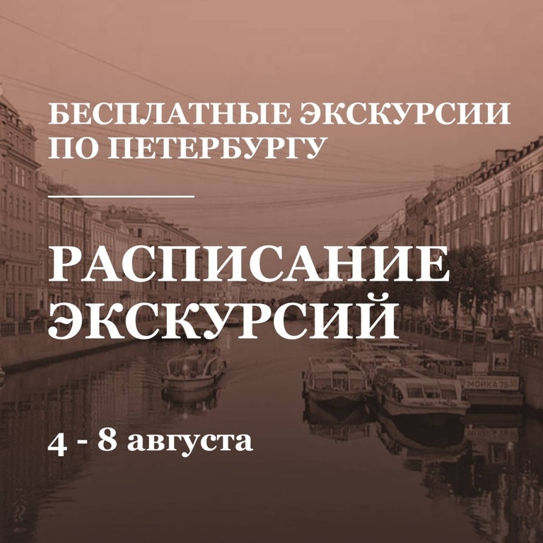 Друзья, расписание: ПЕШИЕ ЭКСКУРСИИ: Запись — > https://clck.ru/3NSzZc 4 августа (понедельник) Бесплатные: 15:00 — 17:00 "Герои или злодеи: две стороны одного мятежа" 16:00 — 17:30 "Дома и люди улицы Чайковского" 17:00 — 18:30 "Петровская набережная сквозь время" 17:00 — 18:30 "Человеки улицы Бассейной" Платные: 19:00 — 21:00 Очная лекция "Трассовая экскурсия в Царское Село и Павловск. Методические советы для экскурсоводов" 5 августа (вторник) Бесплатные: 11:00 — 12:45 "Прогулки по Воскресенской" 12:00 — 13:30 "Восстание декабристов" 13:00 — 14:30 "История одной версты Петергофской дороги. Прогулка по проспекту Стачек" 13:00 — 15:00 "Задворки княжеских мазанок. Улица Галерная" 14:00 — 15:30 "Адреса литературных шедевров" 16:00 — 17:15 "Гагаринская улица: прогулка сквозь века" 17:00 — 18:30 "Театральная Коломна" 19:00 — 21:00 "Между цветными мостами" Платные: 16:00 — 17:30 "Музей-квартира семьи Бенуа (с мини-концертом на арфе)" 19:00 — 20:30 Вместе читаем и обсуждаем "Невский архив: