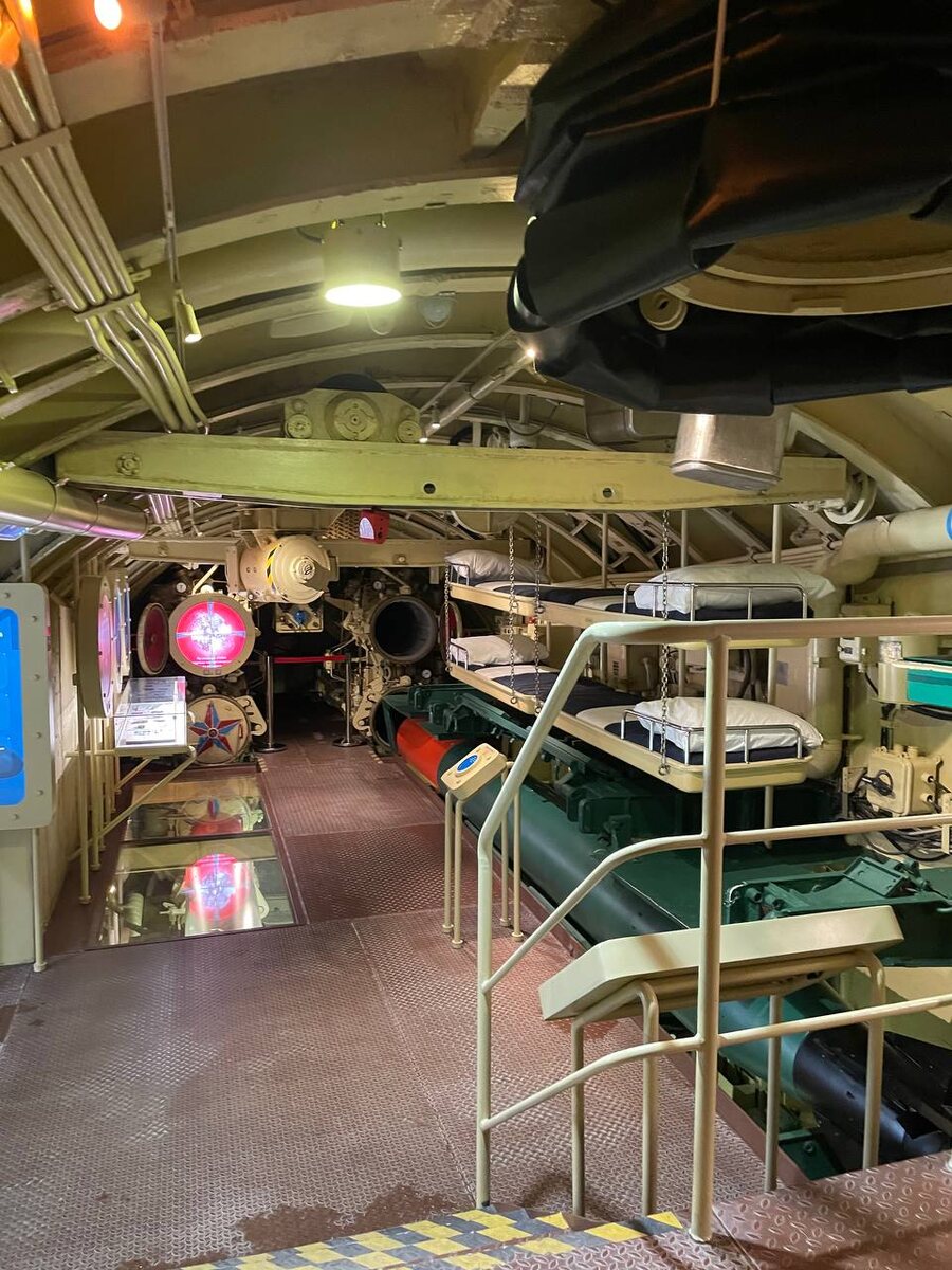 Подводная лодка К-3 Ленинский комсомол. Первая советская атомная подводная лодка. Лодка, покорившая Арктику. Разместилась в музее Военно- морской славы в Кронштадте. Билеты купить можно за месяц. Группы небольшие. Экскурсия в записи. Разочаровывает гостей города своей недоступностью, но и мне, местной, наконец надоело ждать спад ажиотажа, и я отправилась на ловлю билетов. Реально за месяц. Я, конечно, совсем ничего не поняла в рубках, перископах, очень поверхностно понимаю принцип действия атомного реактора. Но мне был интересен именно быт подводников. 3 вахты по 4 часа, дважды в день с перерывам. Койки даже в торпедном отсеке, практически на торпедах. Очень узкие и короткие. Каюта капитана - метра 3. Спальное место на высоте, такое же узкое и короткое. Но у капитана есть персональный умывальник. Посмотрели лазарет, камбуз, кают- компанию, узнали что в рационе было красное вино и красная икра. Оценили, что нательное и пастельное белье было одноразовым, далее пускало