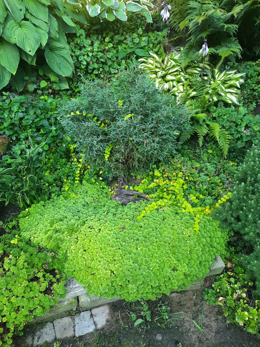 На подпорной стенке разрастается камнеломка. И пятно от выкопанной хосты, прикрытое корягой, она почти заволокла.
