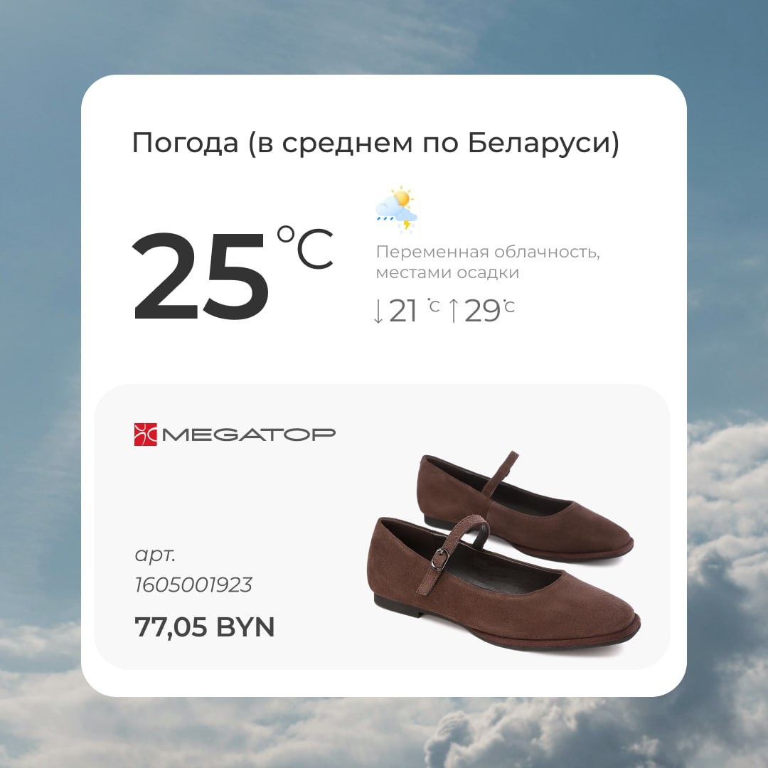 MEGAпрогноз погоды на 4 августа⛅ На старте недели погода решила не выбирать что-то одно: в понедельник будет и солнце (+21…+29 °C), и кратковременные дожди, а кое-где даже и грозы! Чтобы никакая непогода не испортила вам настроение, мы презентуем стильную новинку — замшевые Mary Jane в трендовом шоколадном оттенке🤎 Желаем все продуктивной недели💖