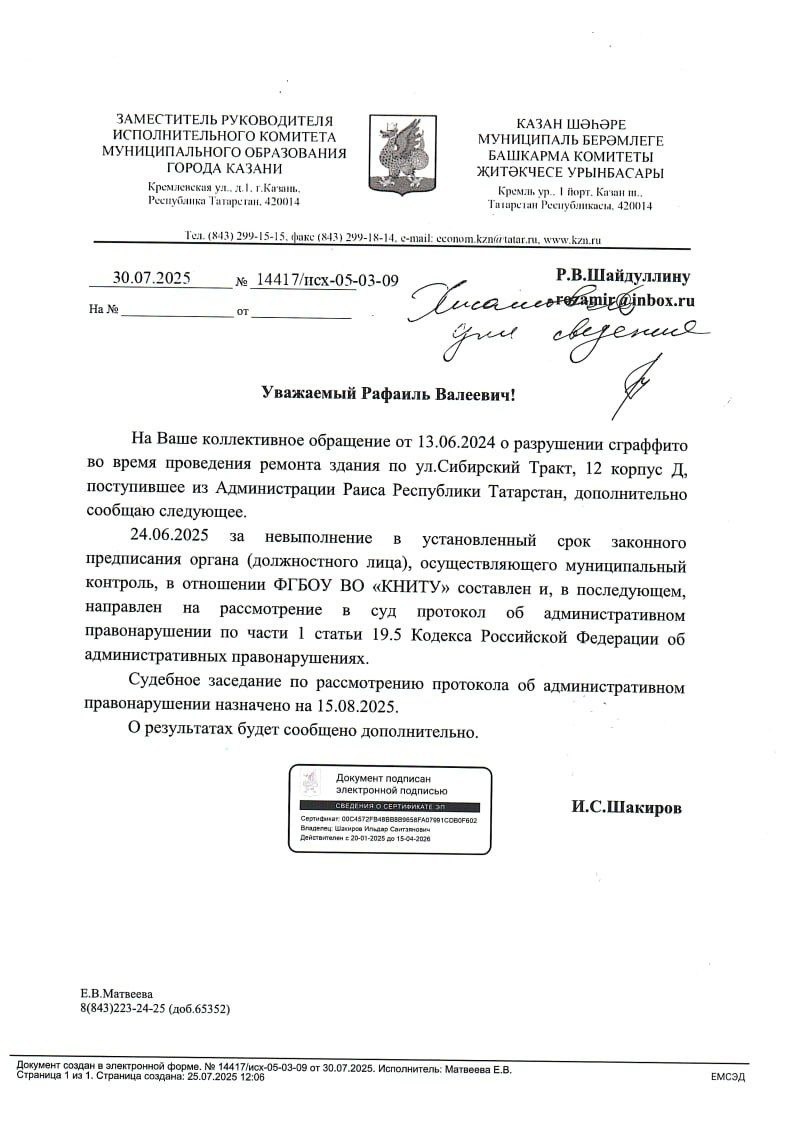 В ответ на пост Ух ты! По поводу закрытия утеплителем сграффито на КНИТУ-КХТИ завели административное дело по части 1 статьи 19.5 Кодекса Российской Федерации об административных правонарушениях: «Невыполнение в установленный срок законного предписания (постановления, представления, решения) органа (должностного лица), осуществляющего государственный надзор (контроль), муниципальный контроль, об устранении нарушений законодательства». Заседание пройдёт 15 августа в 14:00 в зале № 6 судебного участка № 2 по Вахитовскому судебному району г. Казани. Адрес: ул. Коротченко, д. 2. #Кривая_Казань 🔝 Подписаться на Казанца