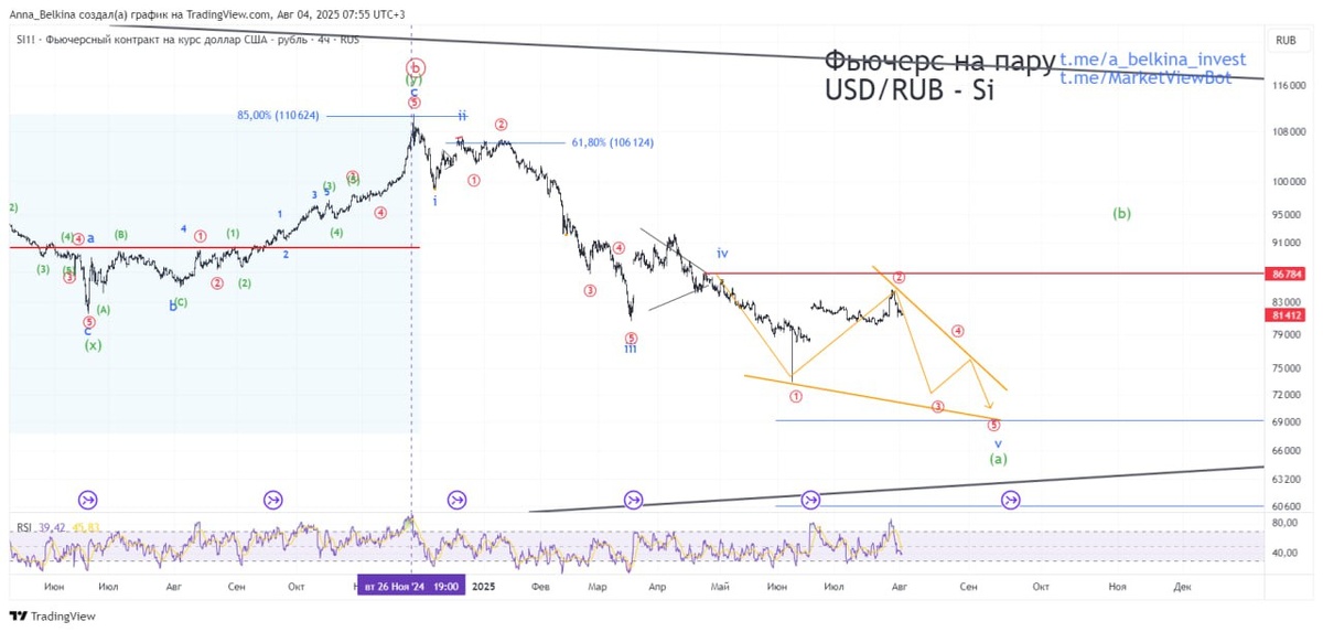 #Si Фьючерс на пару USD/RUB - всплеск цены 28-29 июля напугал многих, пошла речь о развороте рубля против доллара на ослабление..... Однако стоп по текущей гипотезе НЕ пройден. А значит всё еще в развитии конечная диагональ в волне v of (a), в которой поставили глубокую волну [2]. Не является ИИР 💪 Бот Закрытого Канала (подписаться из-за границы, пишите личным сообщением)