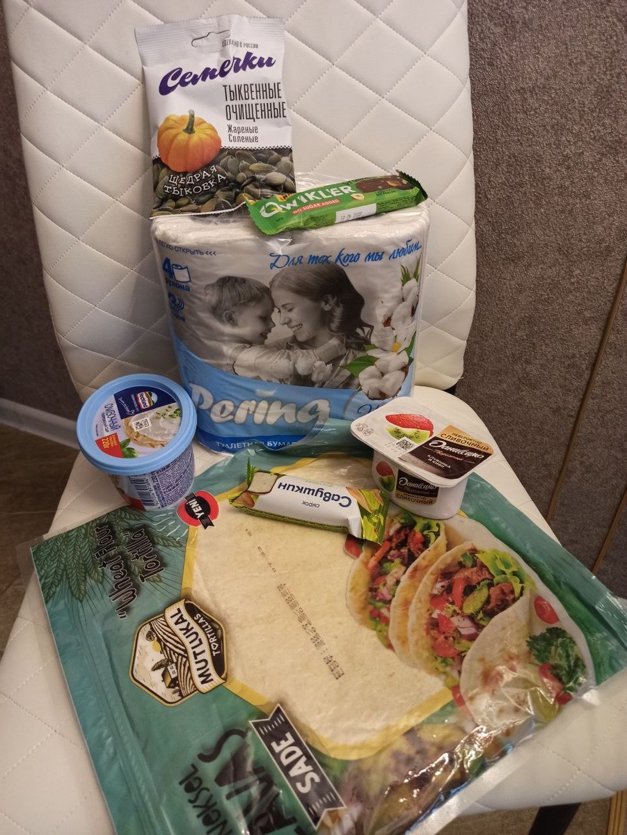 Встретила свою соседку пенсионерку в Магните. Она сказала: Давай зайдем еще в Красное-Белое. Я удивилась и ради интереса согласилась. В КБ я обычно не хожу. Знала, что там продаются и продукты, кроме горячительных напитков, но не думала, что такой обширный ассортимент и привлекательные цены. Спасибо соседке. Теперь буду часто туда ходить. Мои покупки на 500 руб. вы можете видеть ниже: Взяла тортилью. В упаковке 4 лепешки. Стоит 73 руб. (290 г) без одной копейки. Это выгоднее, чем я брала в Ярче за 114 руб. (там 6 шт. но 250 г). То есть эти лепешки толще, а значит есть надежда, что они не будут рваться. Можно нарезать произвольно и в микроволновку или духовку отправить. Получатся хрустящие чипсы. Но у меня есть на эти лепешки другой план. Приготовлю пиццу. Я уже рассказывала как за 15 мин. испечь пиццу без замеса теста: В статье выше есть рецепт. Но состав не очень обрадовал. Там есть пальмовое и рапсовое масло. Ну куда сейчас без "пальмы"? Этот производитель (производитель - Турц