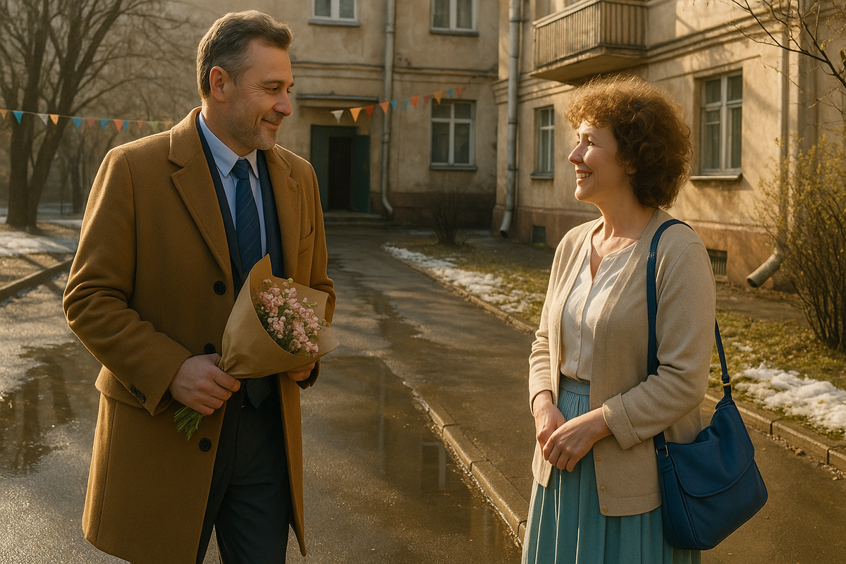 Я стоял у подъезда, перебирая в руках маленький букетик — ничего особенного, но для меня он был как знамя. Галина вышла чуть смущённая — в светлой кофте и с той же сумкой, что была в наш первый день. Прическа аккуратная, как у школьницы перед утренником, а глаза… глаза светятся и боятся одновременно.
