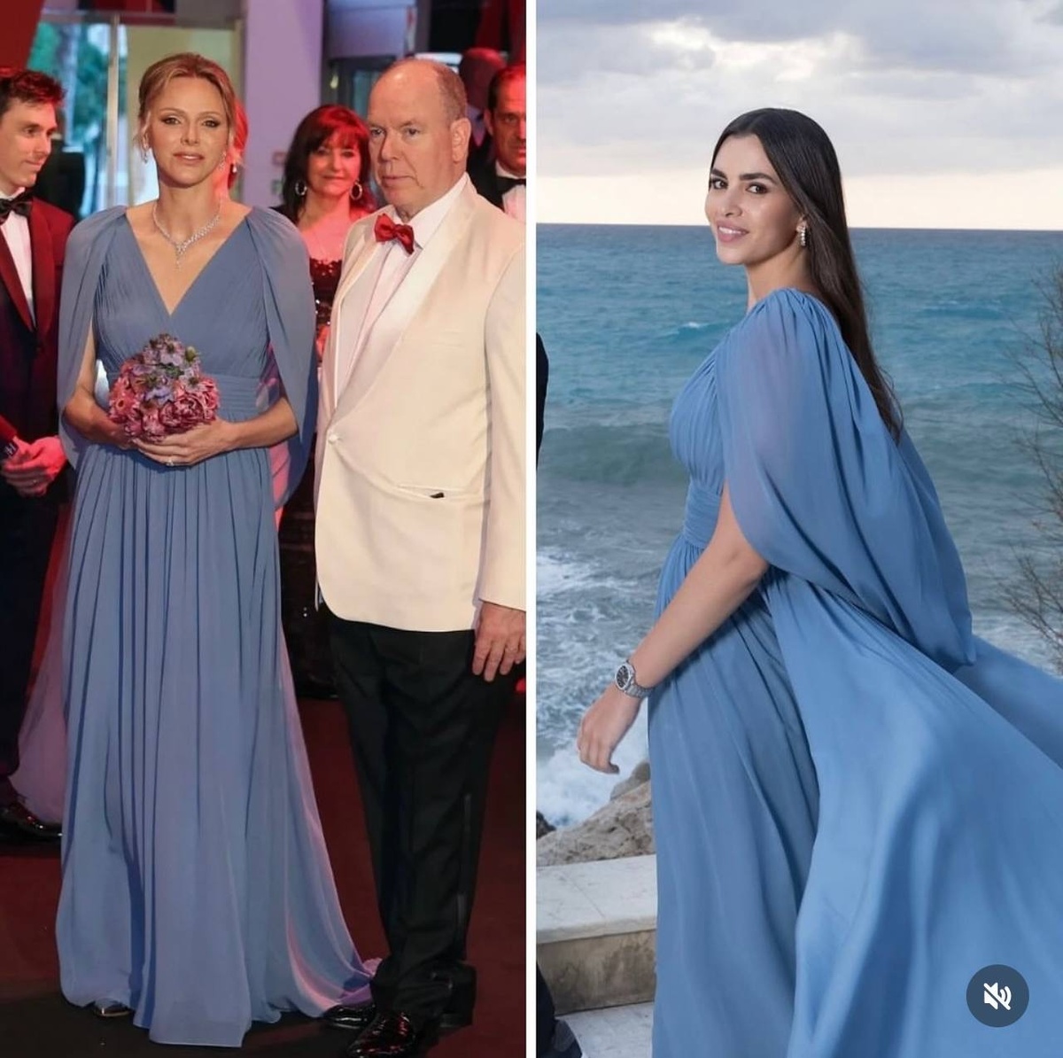 Ну что, друзья, устраиваем модный баттл! На красных дорожках и вечеринках опять случились совпадения, и я собрала самые яркие пары для рубрики «Битва образов». Каждый наряд как ход в шахматы. Иногда выигрывает тот, кто выберет самый смелый фасон, иногда тот, кто лучше подберёт макияж, а иногда просто тот, кто сильнее смотрит в камеру. Смотрим, сравниваем и выбираем фаворитов. Княгиня Монако Шарлен и Зейн Сааб в Elie Saab Вот уж настоящий «воздушный бой»! Шифон со струящейся накидкой, глубокий V-вырез - небесно-голубое платье будто создано для королевских выходов. Шарлен в нём выглядит как королева: строгая, но не холодная, с лёгкой улыбкой, минимум украшений, собранная в пучок прическа, как и положено женщине с титулом. А вот Зейн Сааб, новоиспечённая невестка дизайнера Эли Сааба, в этом же платье, но с другой энергией. Она - молодая, яркая, добавила в образ южной романтики, молодости и лёгкости - распущенные волосы, часы на руке. Один и тот же наряд - два разных настроения. Мой гол