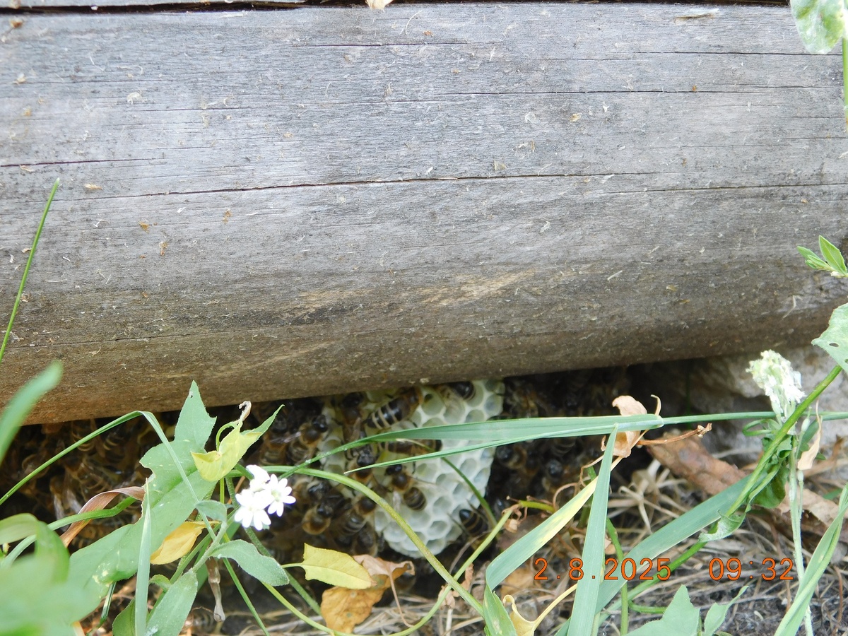 - Работая с пчёлами заметил . что из под улья вылетают пчёлы. Нагнулся и увидел. что там видны соты . Маленькое гнездо пчёл.