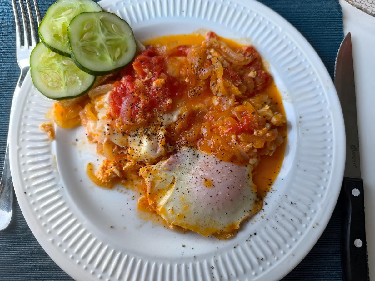Проснулась около шести часов утра без будильника. Спала всю ночь, а уснула в десятом часу вечера. Отлично выспалась и чувствую себя отдохнувшей. Акклиматизация на этот раз прошла быстрее. Думаю, это и от питания тоже зависит. Вчера мясо было с утра (тефтельки), а в обедоужин овощи и арбуз. И 22000 шагов, чтобы растратился гликоген -- и вуаля! Сегодня прекрасное настроение! Выпила горячей воды, переделала свои утренние рутины с какой-то молодецкой удалью. В Анапе сегодня жара, поэтому прогулок будет значительно меньше и то вечером, когда наступит прохлада. Недавно была у терапевта после прохождения диспасеризации, она сказала, что немного повышен гемоглобин. Пью мало воды. Поэтому поберегусь разгуливать по жаре с загущенной кровью. Посижу в тени деревьев на бульваре. Там ещё и ветерок. Мой завтрак: яичница по-сочински и бутерброд с сыром Сиртаки и огурцом с Подмосковной дачи. Рецепт яичницы по-сочински ТУТ: В "Магните" купила мешок для стирки кроссовок. Отличная вещь! Ни разу не видел