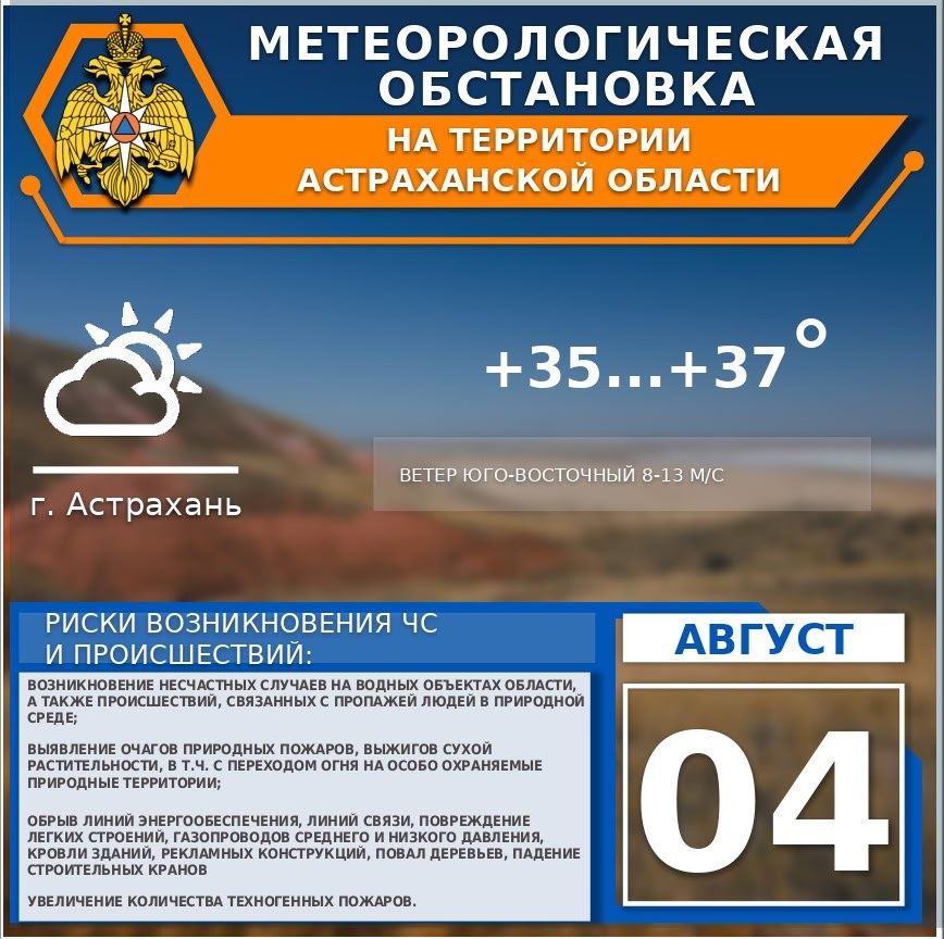 По г. Астрахань переменная🌤 облачность. Без существенных осадков. Ветер💨 юго-восточный 8-13 м/с. Температура🌡 воздуха днем +35...+37°, ночью +25...+27°.