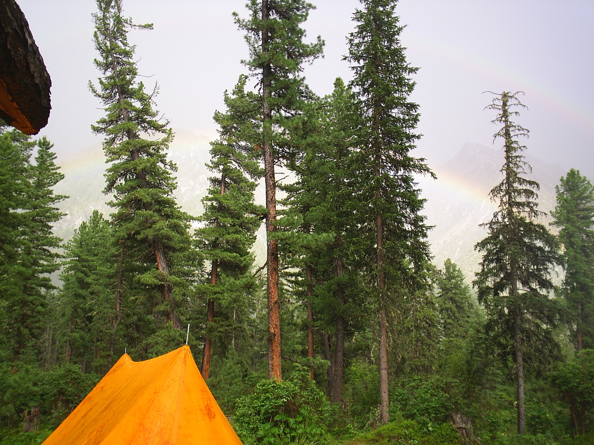Последний день выдался особенно тёплым и ясным. Мы долго с грустью бродили по привычным дорожкам и наслаждались чудесными видами. Пили из любимых источников, несколько раз искупались. Но всё когда-нибудь заканчивается. Подошел к концу и этот последний день. К вечеру вдруг на совершенно ясном небе появилась тучка, и закрапал мелкий, почти невесомый дождик. Водяная взвесь мельчайшими капельками стояла в прогретом за день воздухе, и солнце ярко светило, переливаясь в каплях всеми цветами радуги, заливая ровным оранжевым светом всё наше маленькое стойбище. Вдруг Алексий восторженно завопил и опрометью бросился за камерой. Мы сначала ничего не поняли, но когда он расчехлил Соньку и принялся снимать небо, увидели прямо над собой две ярких радуги, сиявших ровными дугами друг над другом. Это было великолепное зрелище. Крупная радуга снизу переливалась всеми семью яркими чистыми оттенками. Каждый оттенок в кристально прозрачном воздухе был насыщенным и необычно ярким. Верхняя, слегка расплывчатая дуга была более нежной, с мягкими почти незаметными переходами цветов. Обе дуги сияли над нами несколько минут, а потом стали постепенно исчезать, будто невидимый художник аккуратно размывал огромной кистью акварели на картине. Опомнившись, мы тоже побежали за фотоаппаратами. Однако, радуга стремительно исчезала. Сначала истаяла верхняя дуга, затем поплыла и нижняя. Цвет её все более выцветал, переходы терялись, и вскоре на закатном небе от радуги не осталось следа. Мы со вздохом разочарования проводили красоту. Расходились молча и грустно.