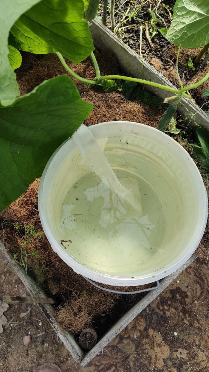 Здравствуйте, мои хорошие 🤗 Я попробовала систему доморощенного полива🤩 Вообщем уезжала на работу, и милый в Москве, и сосед на работе, а огурчики надо поливать.. Полила их хорошо и поставила 2 ведра, наполнила водой до краев и опустила тряпочку хлопковую, смочила полностью, один конец в ведро, другой на грунт к огурчикам... Приехала - проверила. Грунт не мокрый, но и не сухой! На 1 и 3 фото видно сколько было и стало воды в ведре👆 Вообщем ничего, можно так перекантоваться! Домашние цветы на период отпуска точно. Ставят горшки в центр комнаты, не на открытое солнце. и также ведро и тряпочки или хлопковые шнурки, смочить и протянуть из ведра в горшки. 🤗Кто еще какой знает способ автополива, делитесь в комментариях.