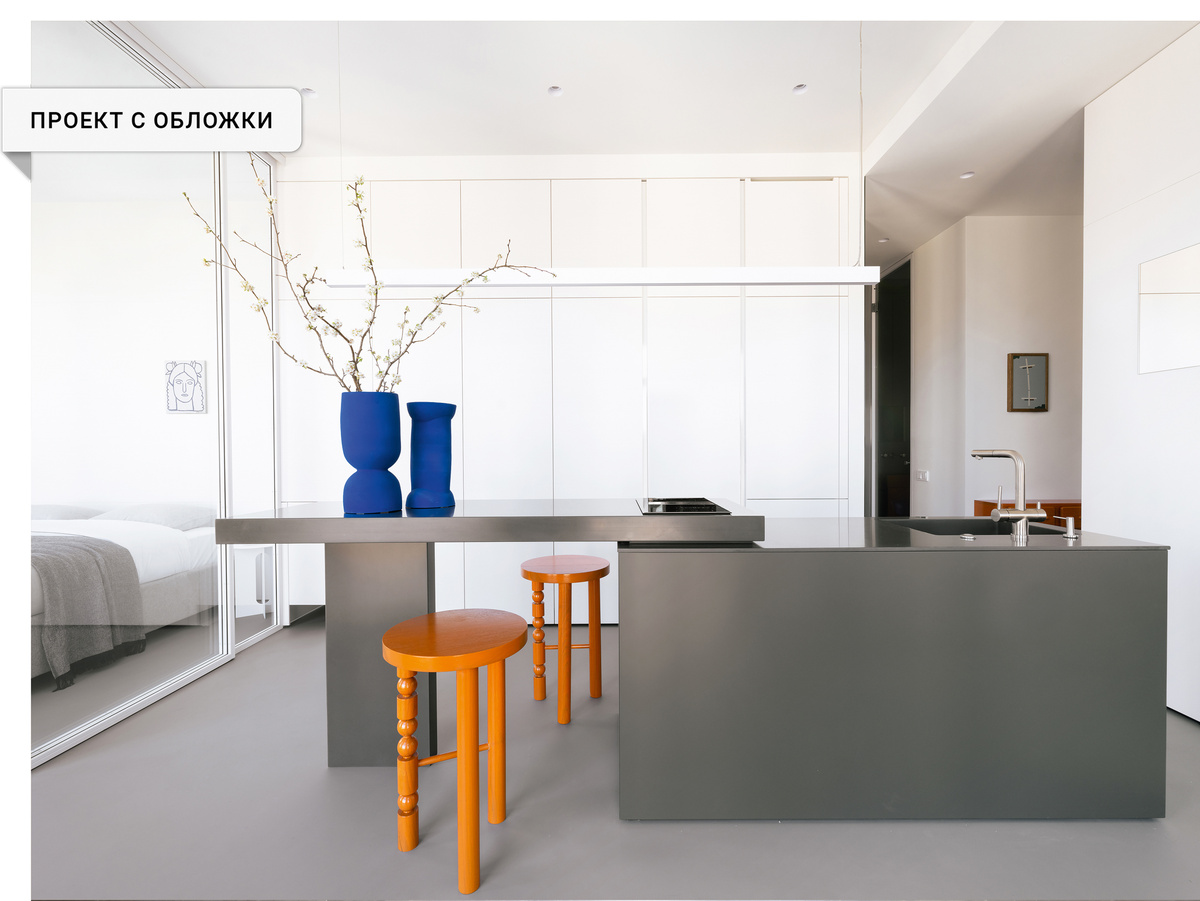 В этой квартире 47 метров и ни одного лишнего движения. Пространство строится на ощущениях, как картина на холсте. Солнечный оранжевый, асимметрия, искусство и легкость — интерьер вдохновлен работами Марка Шагала. Нестандартная форма не стала помехой для архитектора Алексея Аладашвили, а, наоборот, стала поводом для эксперимента: зонирование символично, мебель по авторским эскизам, кухня — в коридоре, а раковина — в комнате. Каждая деталь работает на атмосферу. Подробности рассказывает автор. Трапециевидная форма — нестандартная и сложная задача, для решения которой важно соблюсти баланс не только конструкций, но и цветовой гаммы. Акцентным цветом стал солнечный оранжевый. Зонирование квартиры выполнено максимально легко. Единственная перегородка создает символическую границу между спальной и общественной зонами. Помимо кровати и пуфа из букле возле окна есть небольшое консольное рабочее место для сосредоточенной работы будущих жильцов. Чтобы минимизировать визуальный шум, все места хр